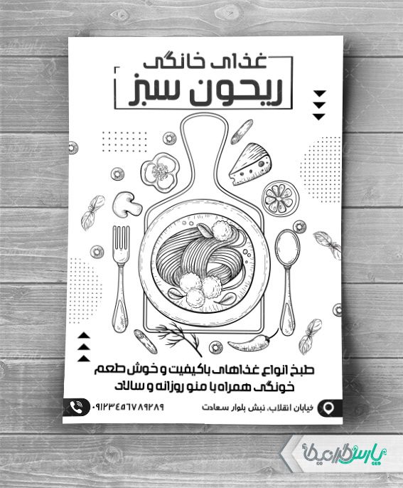 طرح تراکت سیاه و سفید رستوران و غذای آماده، توسط طراحان پارس گرافیک جهت بازاریابی فروشگاه ها و یا تبلیغات در سطح شهر توسط کاسبان این شغل طراحی و در دسترس کابران سایت قرار گرفته است.