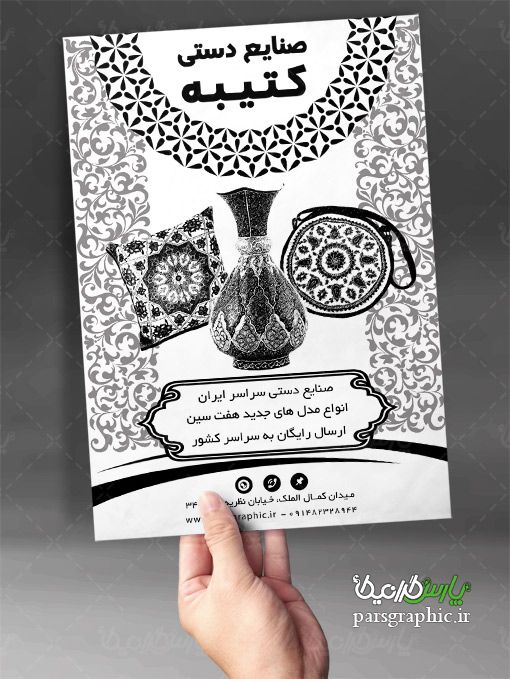 طرح تراکت ریسو فروشگاه صنایع دستی به صورت عمودی طراحی شده است.