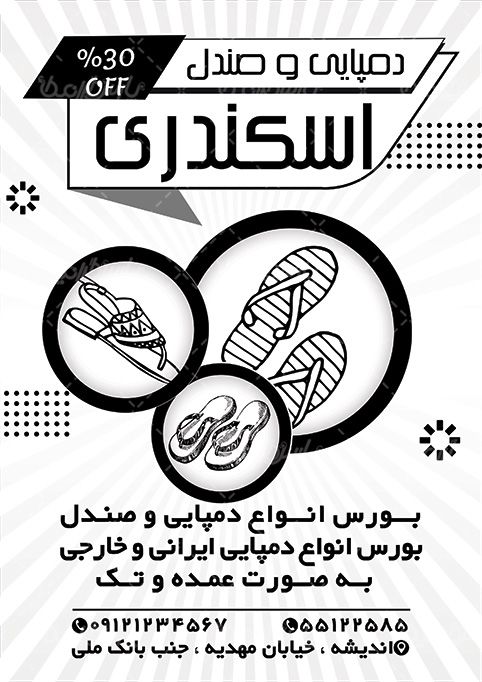 تراکت ریسو فروشگاه صندل , طرح ریسو فروشگاه صندل و دمپایی , تراکت ریسو , طرح لایه باز ریسو فروشگاه صندل و دمپایی , تراکت سیاه سفید ,