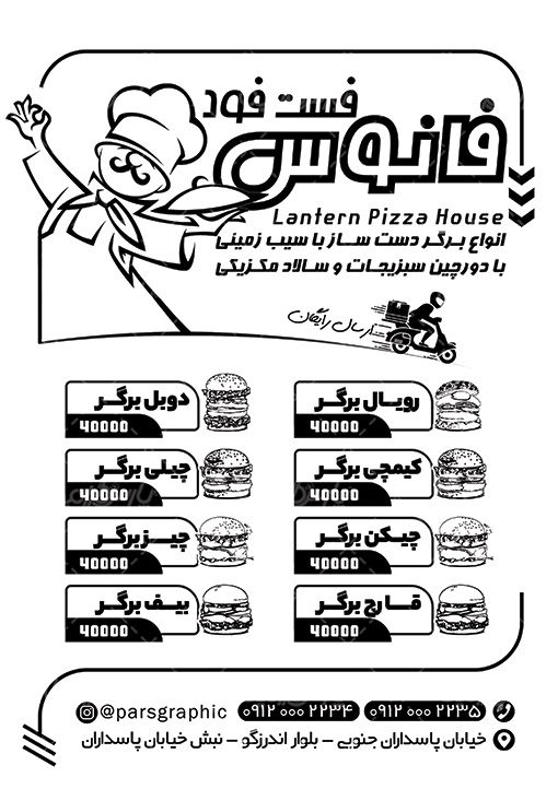 طرح تراکت سیاه و سفید اغذیه توسط تیم حرفه ای پارس گرافیک طراحی و در دسترس کاربران سایت قرار گرفته است.