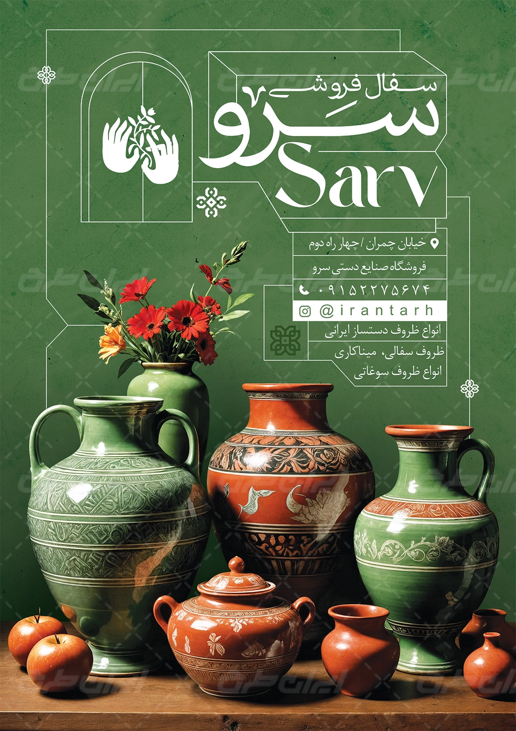 - همنشینی مناسب رنگ سبز و طرح تراکت فروشگاه سفال