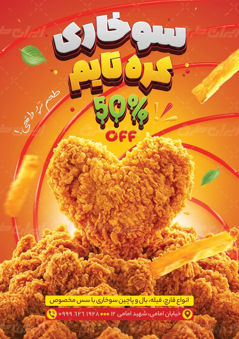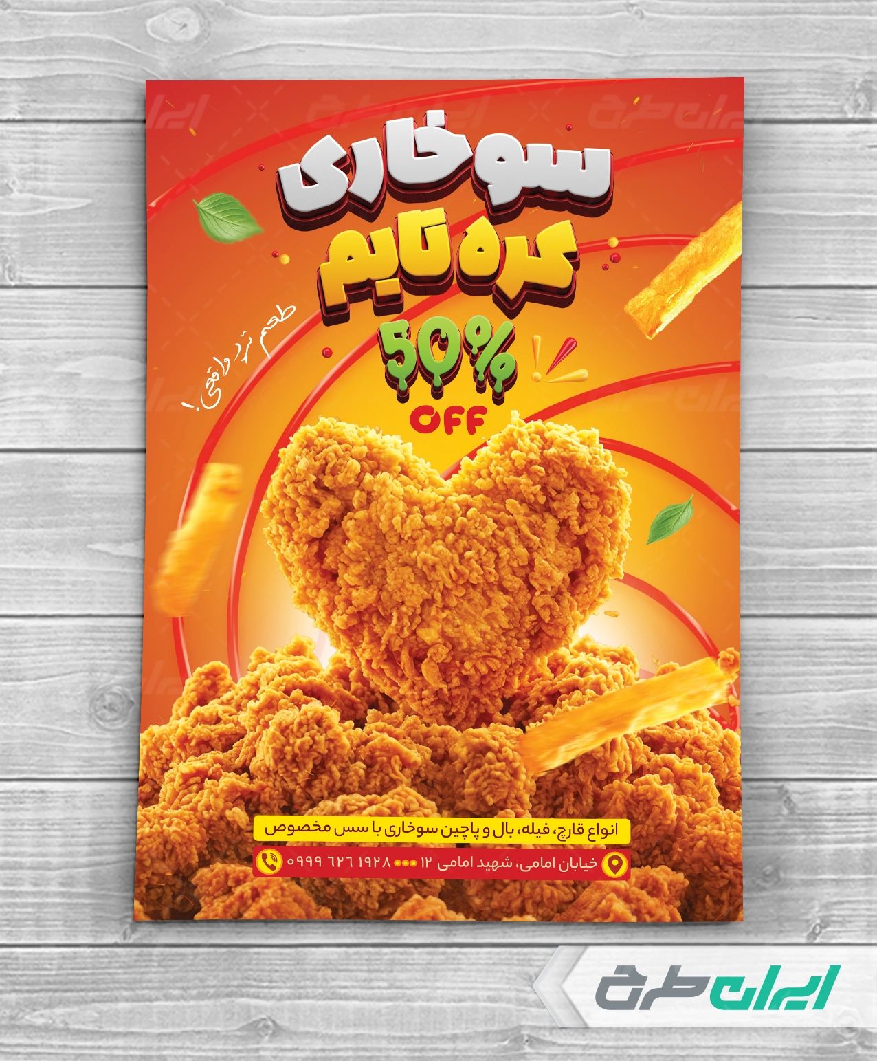 عکس مرغ سوخاری، تصویر مرتبط با طرح تراکت، فست فود، لیبل و شیپ های کاربردی می باشد که توسط طراحان ایران طرح در نرم افزار فتوشاپ طراحی شده است.