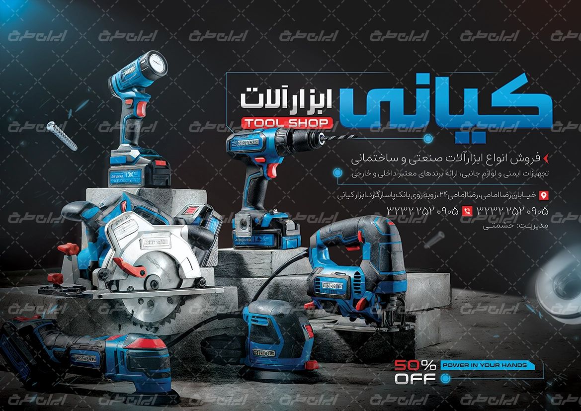 - استفاده از عکس باکیفیت ابزار یراق که مناسب با طرح تراکت لایه باز ابزار فروشی