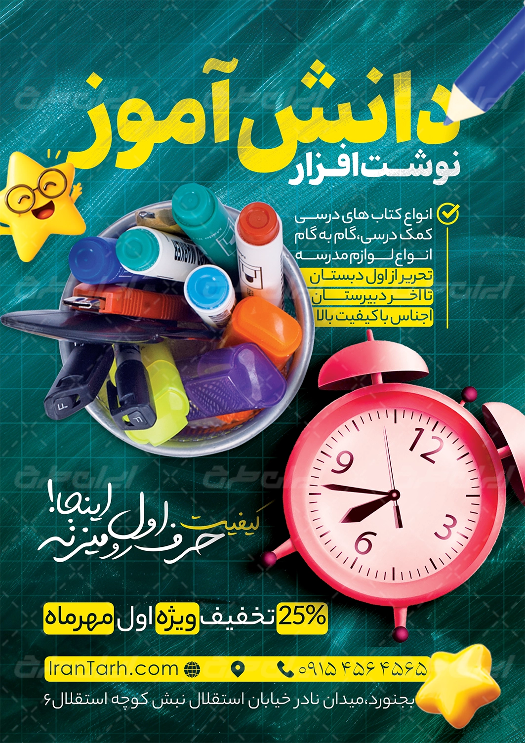 طرح تراکت لایه باز فروشگاه نوشت افزار، جهت بازاریابی و تبلیغات این دسته از فروشگاه ها توسط تیم طراحان ایران طرح طراحی و در دسترس کاربران سایت قرار گرفته است.