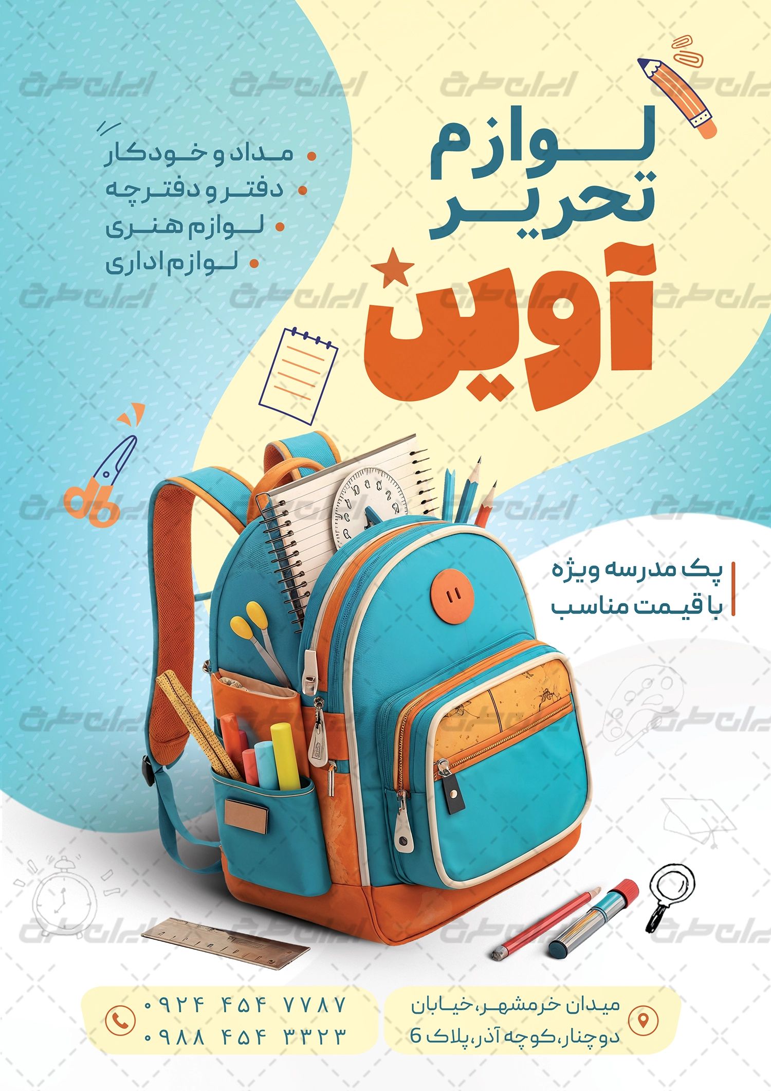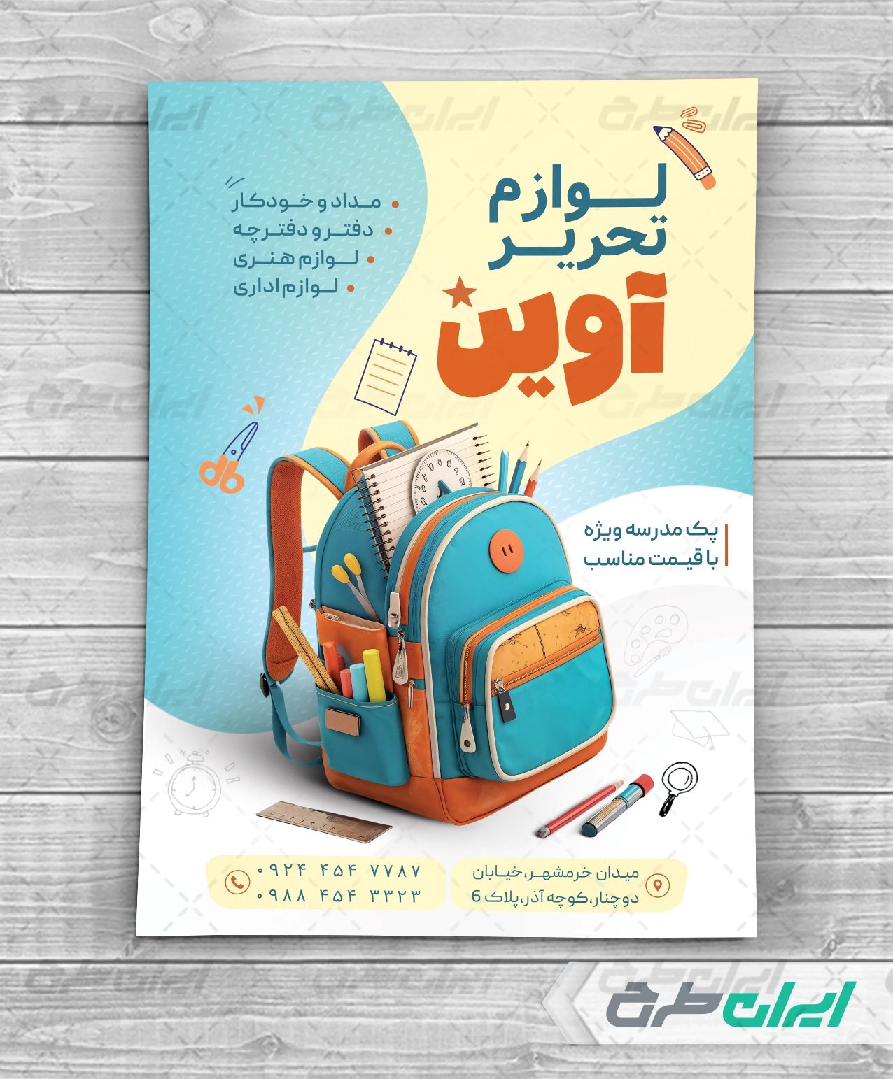 طرح تراکت لایه باز فروشگاه نوشت افزار، جهت بازاریابی و تبلیغات این دسته از فروشگاه ها توسط تیم طراحان ایران طرح طراحی و در دسترس کاربران سایت قرار گرفته است.