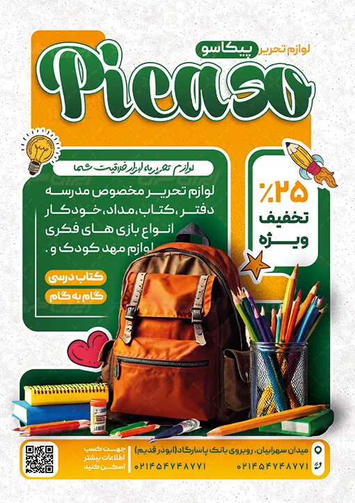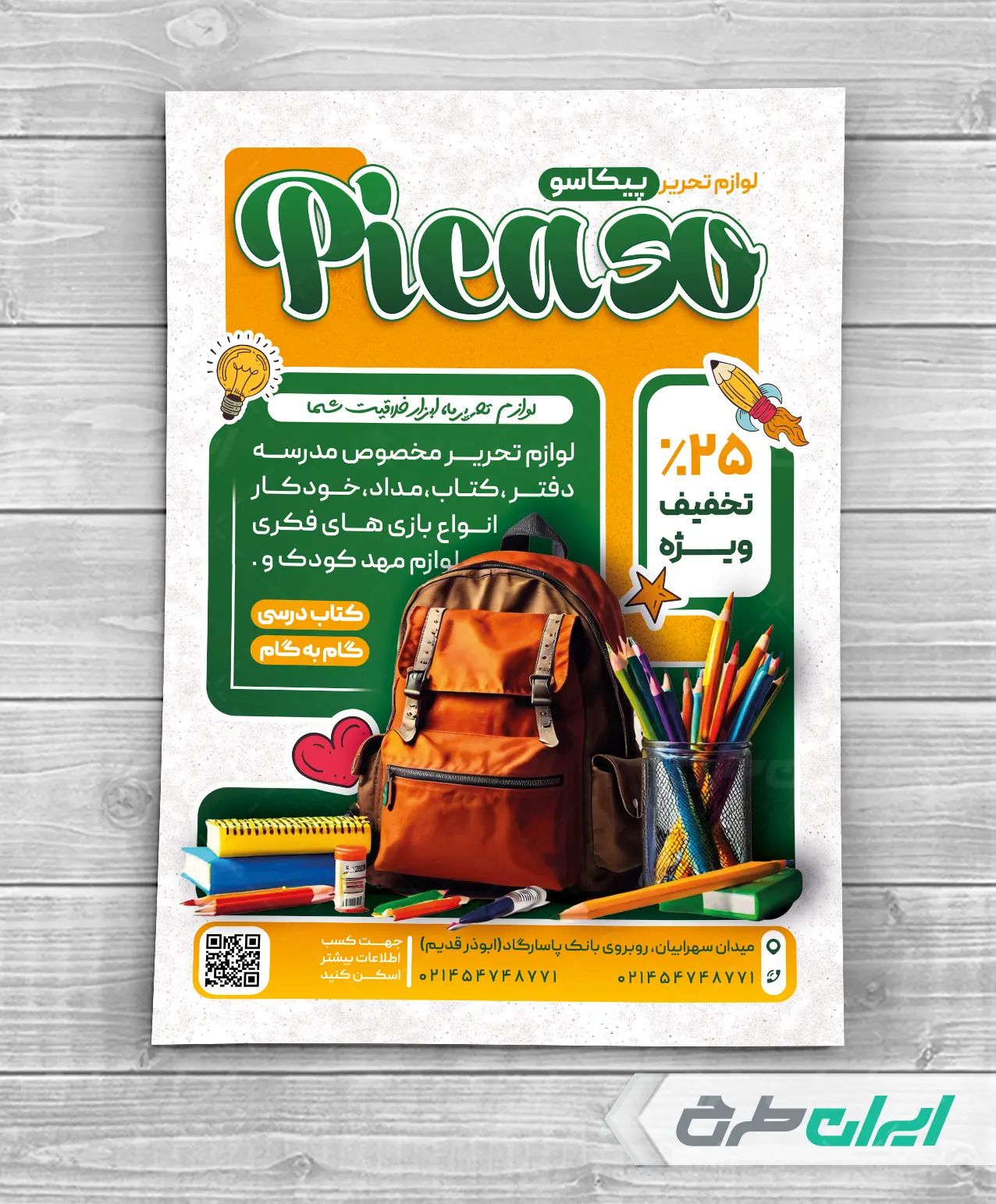 طرح تراکت لایه باز فروشگاه نوشت افزار، جهت بازاریابی و تبلیغات این دسته از فروشگاه ها توسط تیم طراحان ایران طرح طراحی و در دسترس کاربران سایت قرار گرفته است.