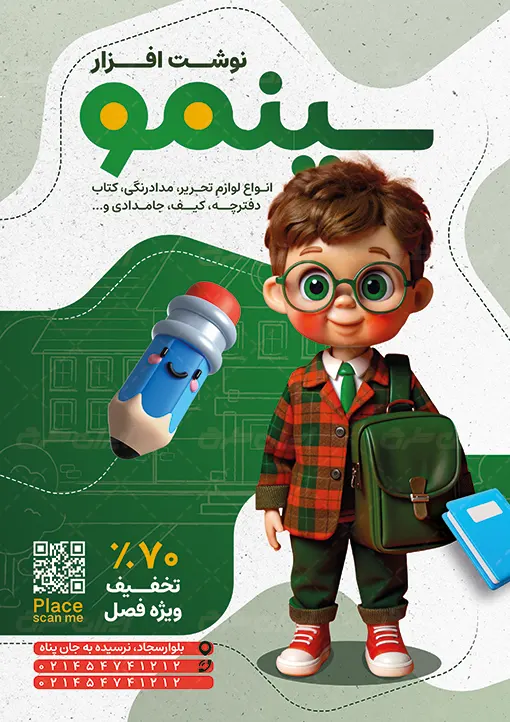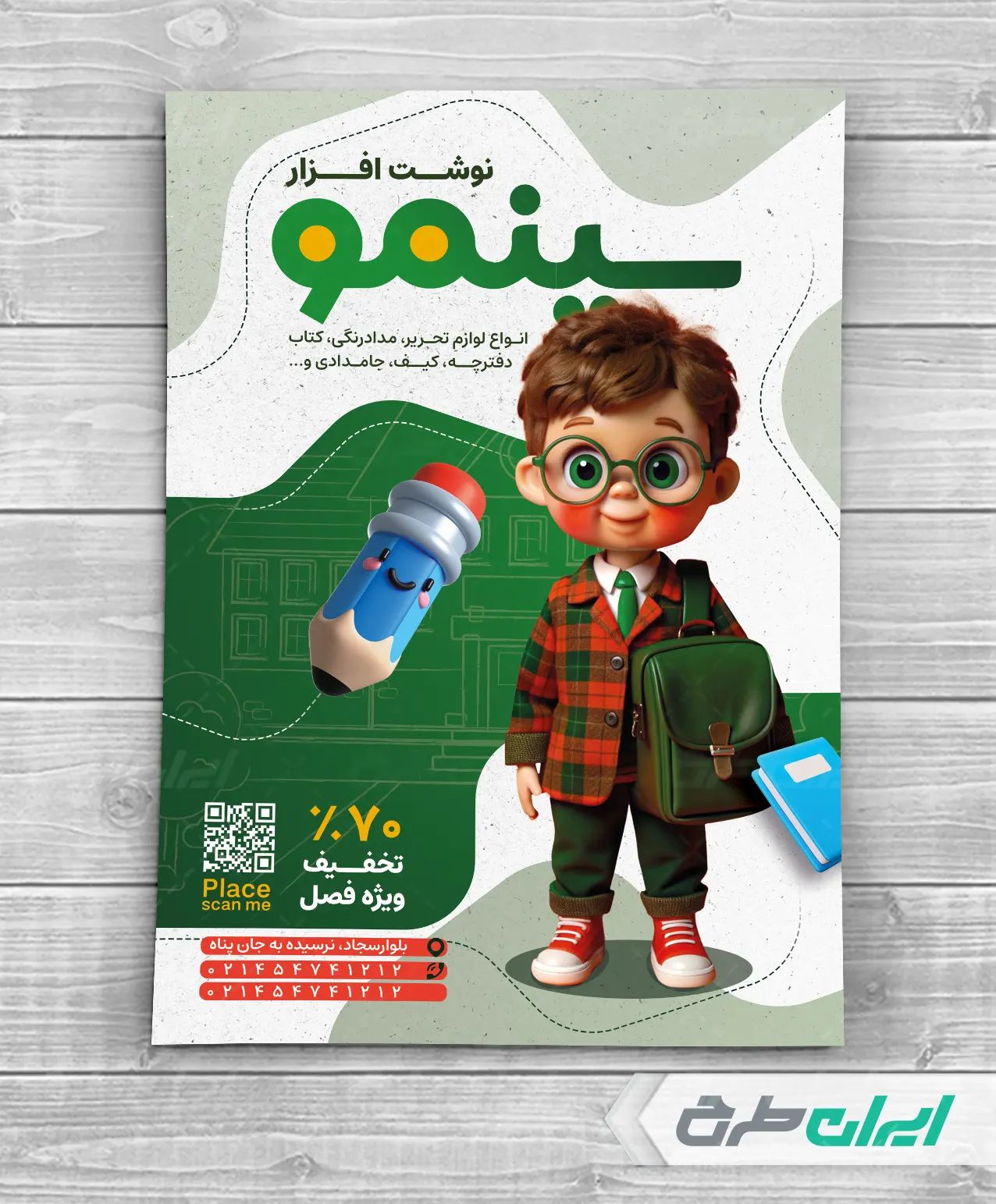 طرح تراکت لایه باز فروشگاه نوشت افزار، جهت بازاریابی و تبلیغات این دسته از فروشگاه ها توسط تیم طراحان ایران طرح طراحی و در دسترس کاربران سایت قرار گرفته است.