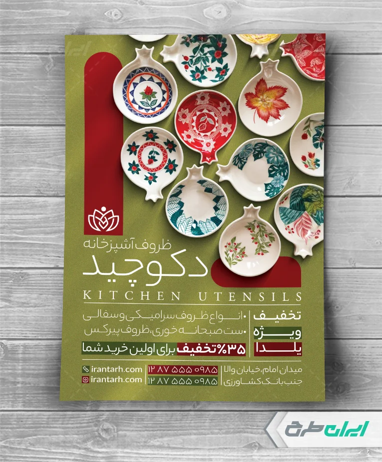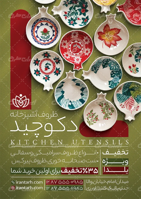 - هم نشینی مناسب رنگ سبز با طرح تراکت لوازم آشپزخانه