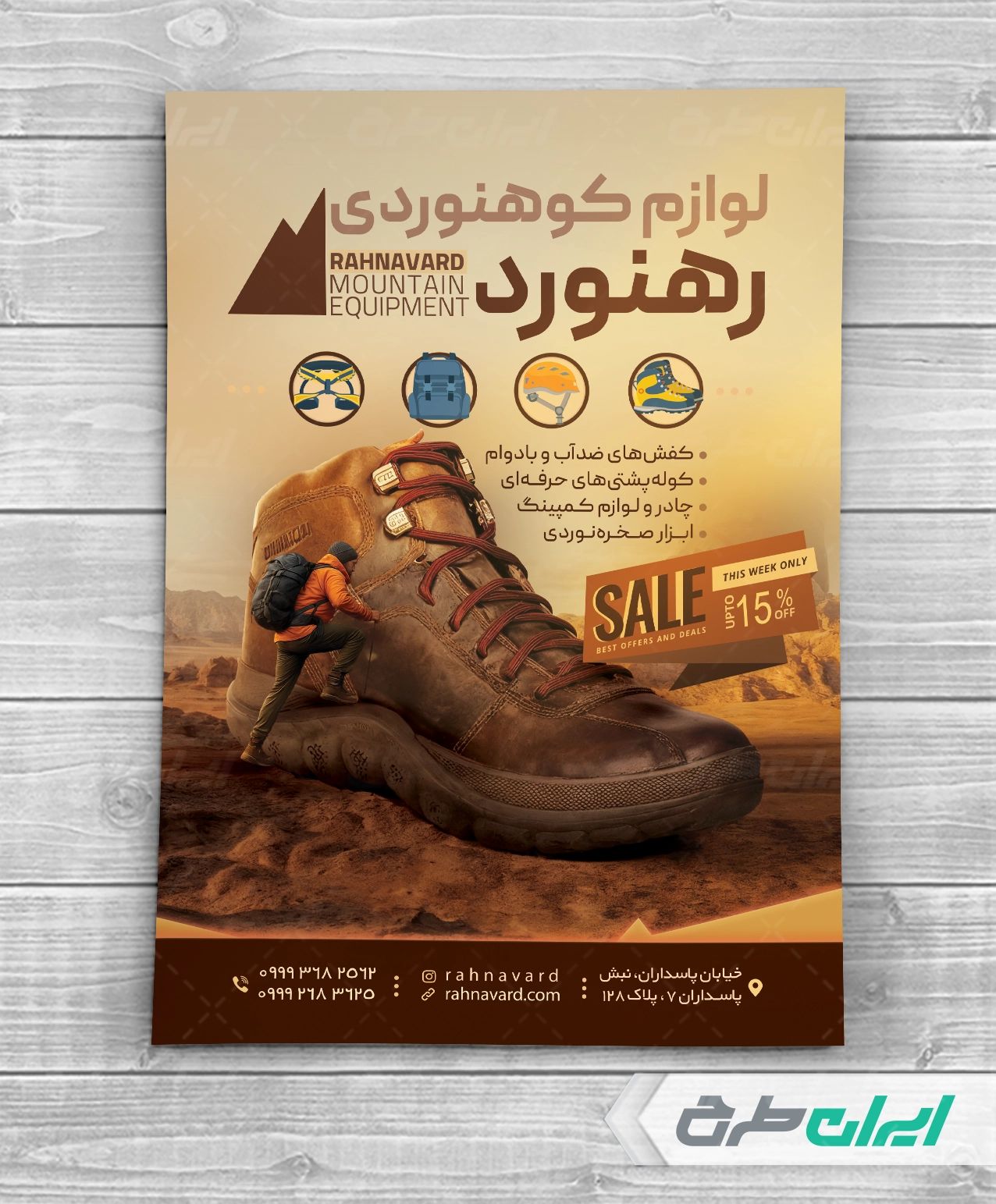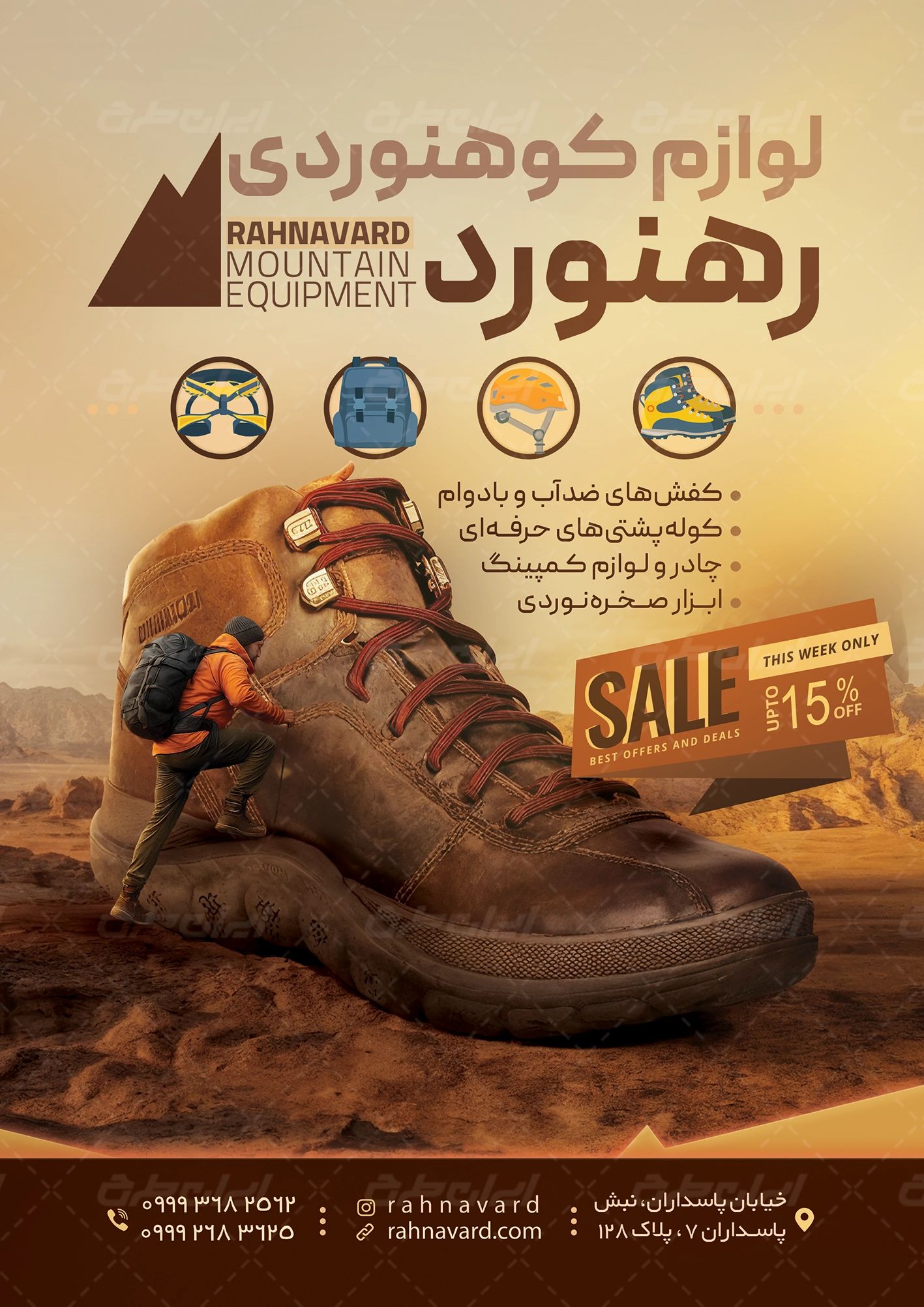 طرح تراکت لایه باز لوازم کوه نوردی و کمپینگ جهت تبلیغات و بازاریابی این فروشگاه ها توسط تیم ایران طرح طراحی شده است.