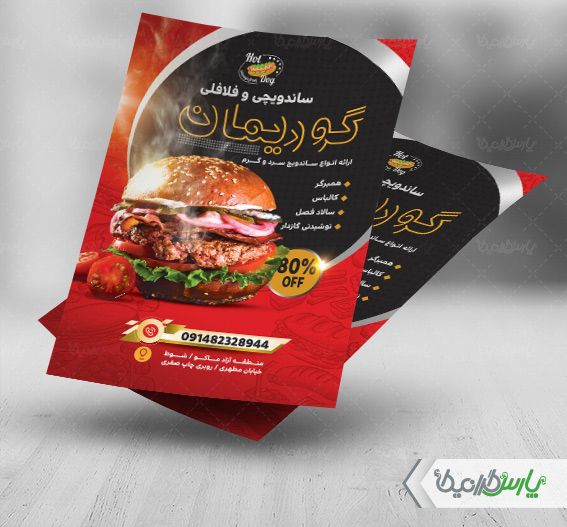 طرح تراکت فست فود با پس زمینه قرمزو بصورت عمودی طراحی شده و در طرح از تصویر دوربری شده ساندویچ همبرگر استفاده شده است.
