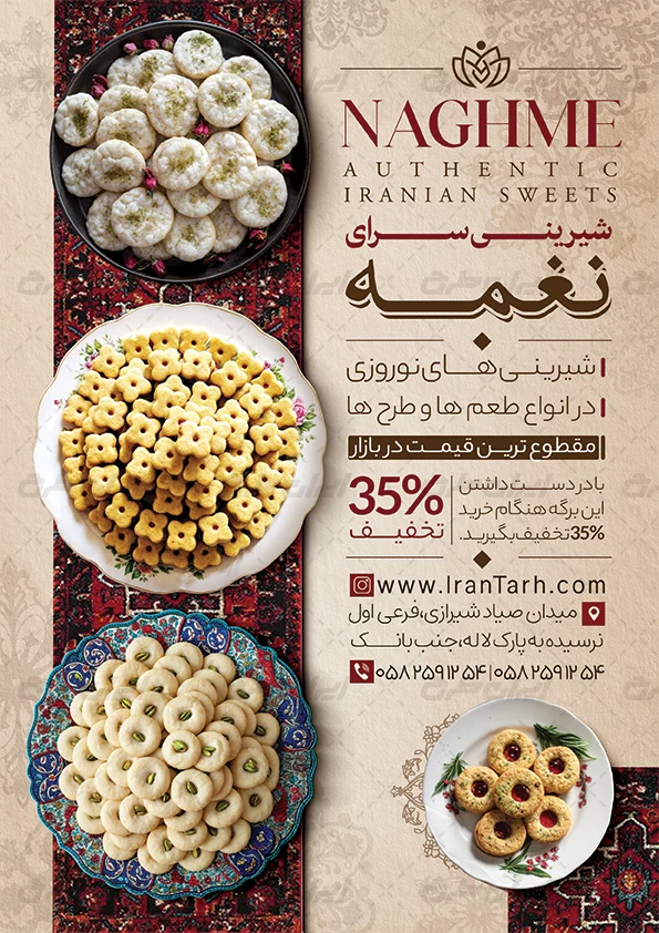 طرح تراکت لایه باز شیرینی سرا، جهت تبلیغات این فروشگاه ها توسط طراحان ایران طرح طراحی شده است.