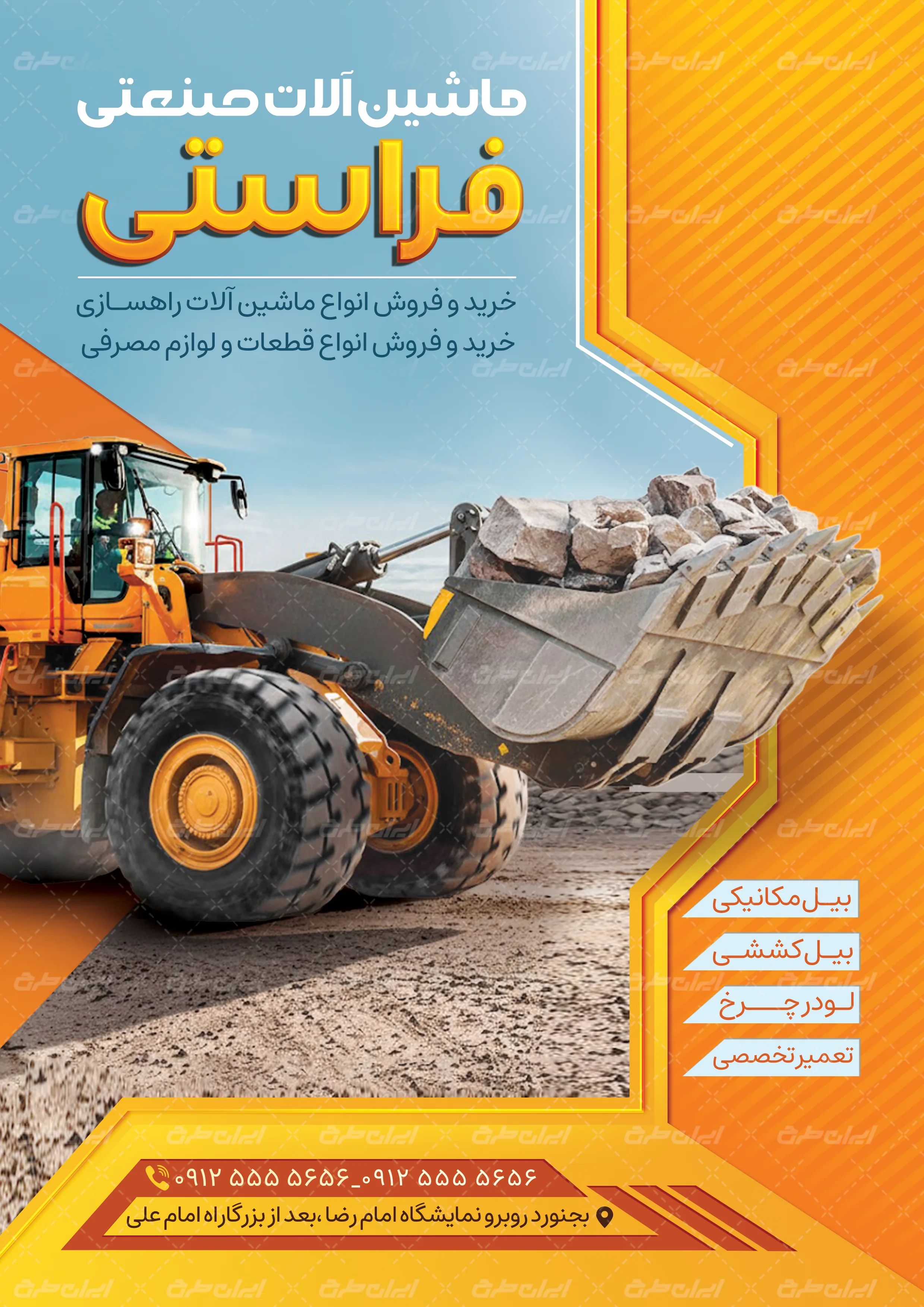 طرح تراکت لایه باز ماشین های راه سازی، توسط تیم ایران طرح برای بازاریابی و تبلیغات این دسته از مشاغل طراحی شده است.