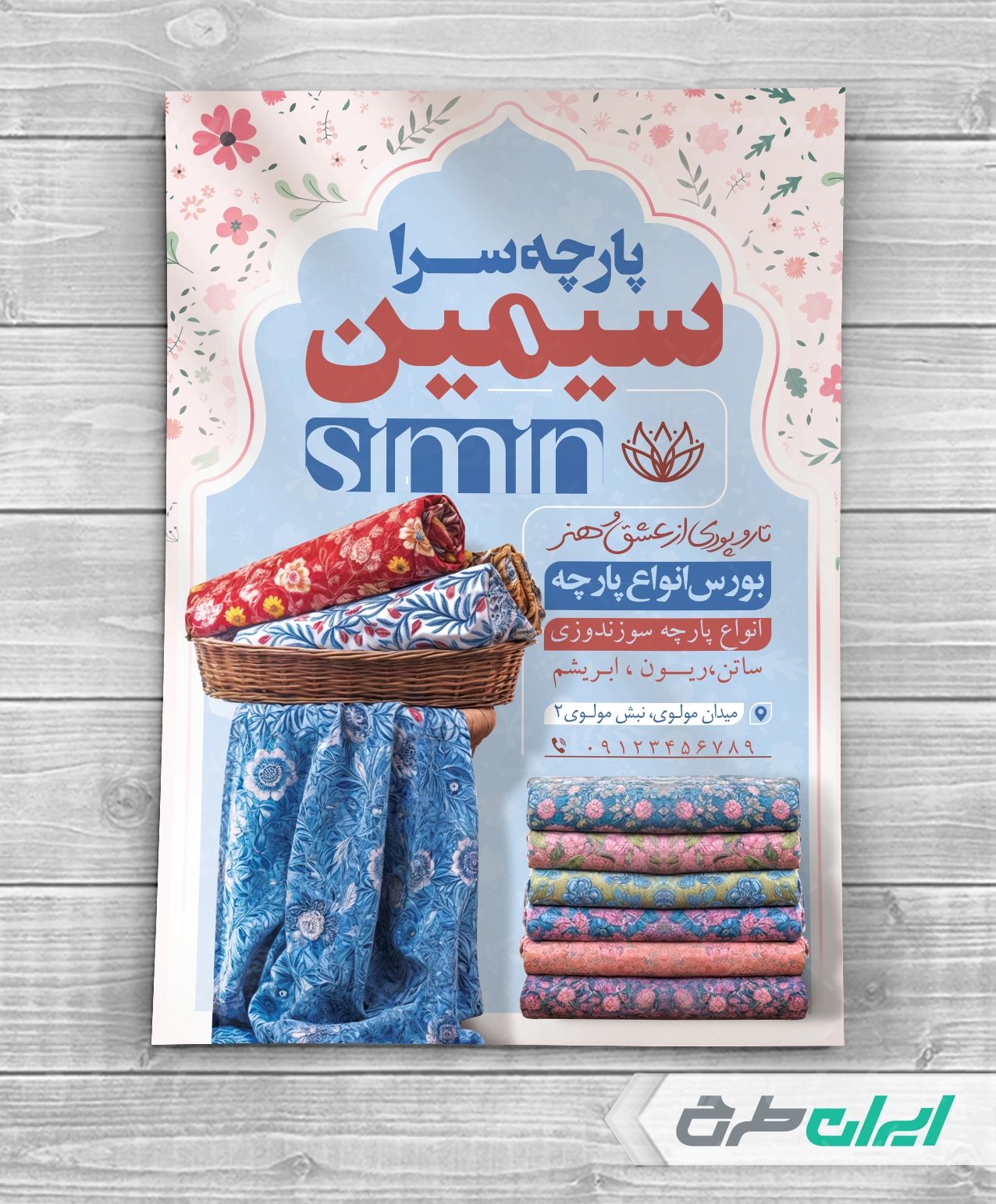 طرح تراکت لایه باز پارچه سرا، توسط تیم ایران طرح برای بازاریابی و تبلیغات این فروشگاه طراحی شده است.