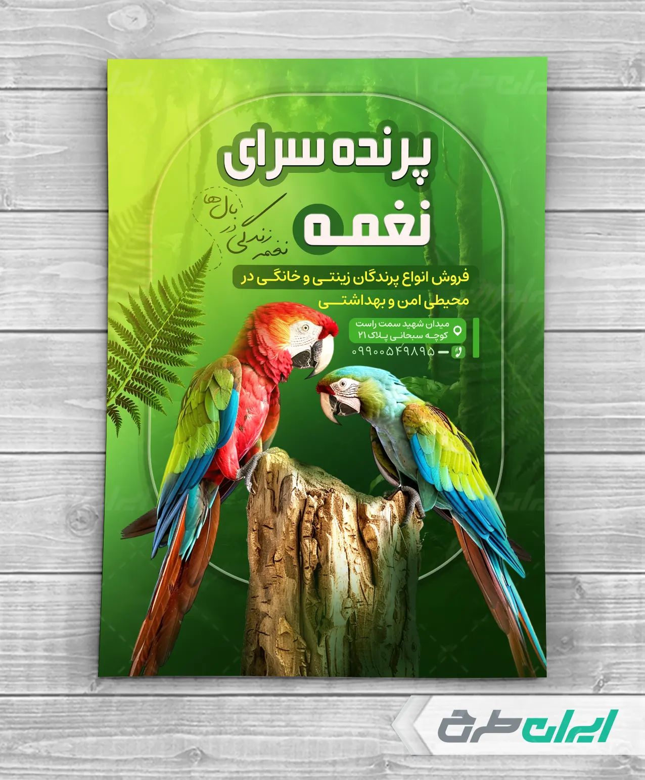 - طراحی تراکت با استفاده از تصویر طوطی در طرح تراکت پرنده فروشی