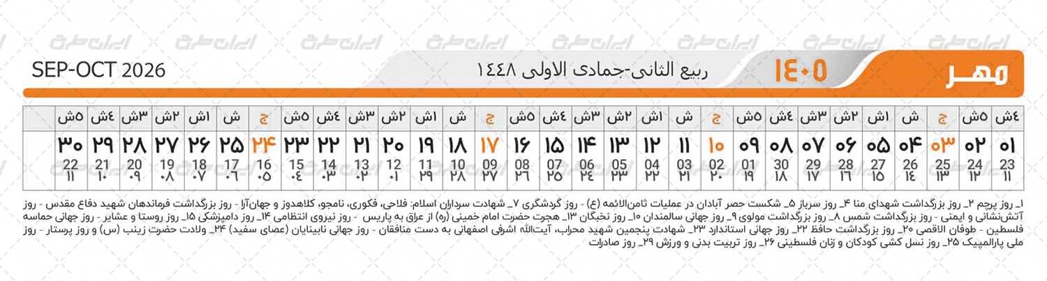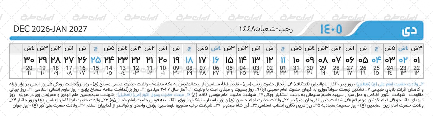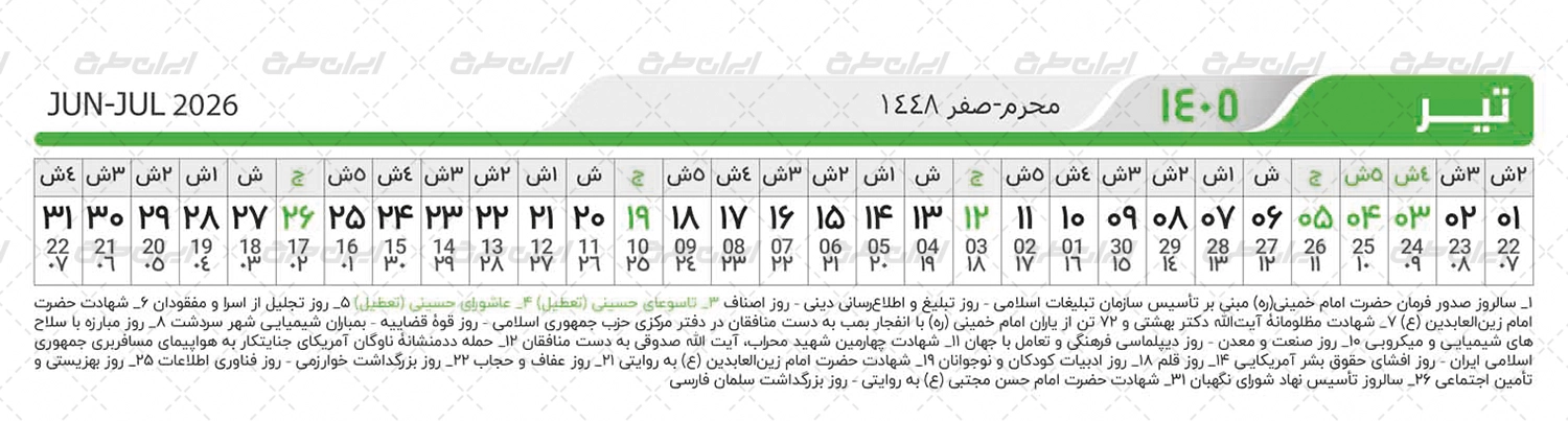 جدول بندی ماه های سال، ایام هفته، شمارش روز ها، مناسبت های شمسی و قمری، مناسبت های ملی و جهانی، لیبل ها و شیپ های کاربردی می باشد که به صورت لایه باز در نرم افزار فتوشاپ طراحی شده است.