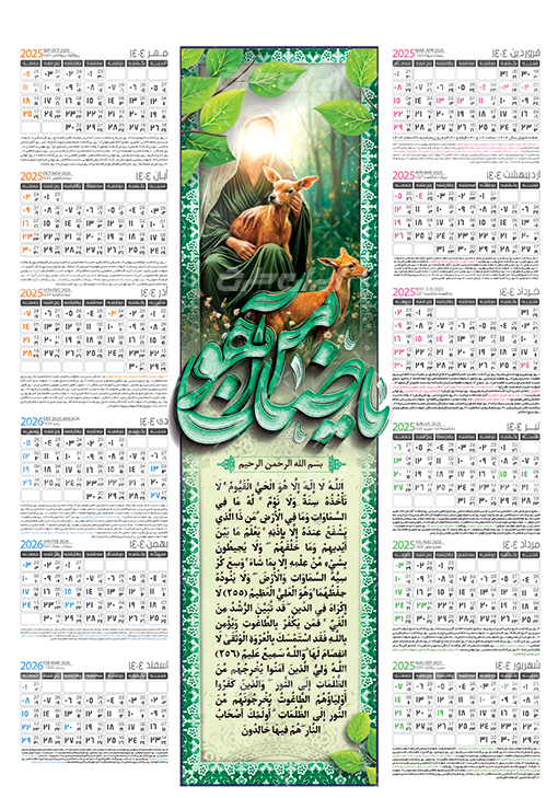 تصویر حرم امام رضا، تذهیب، جدول ماه و ایام هفته، لیست مناسبت های ملی و جهانی، لیبل و شیپ های کاربردی می باشد.
