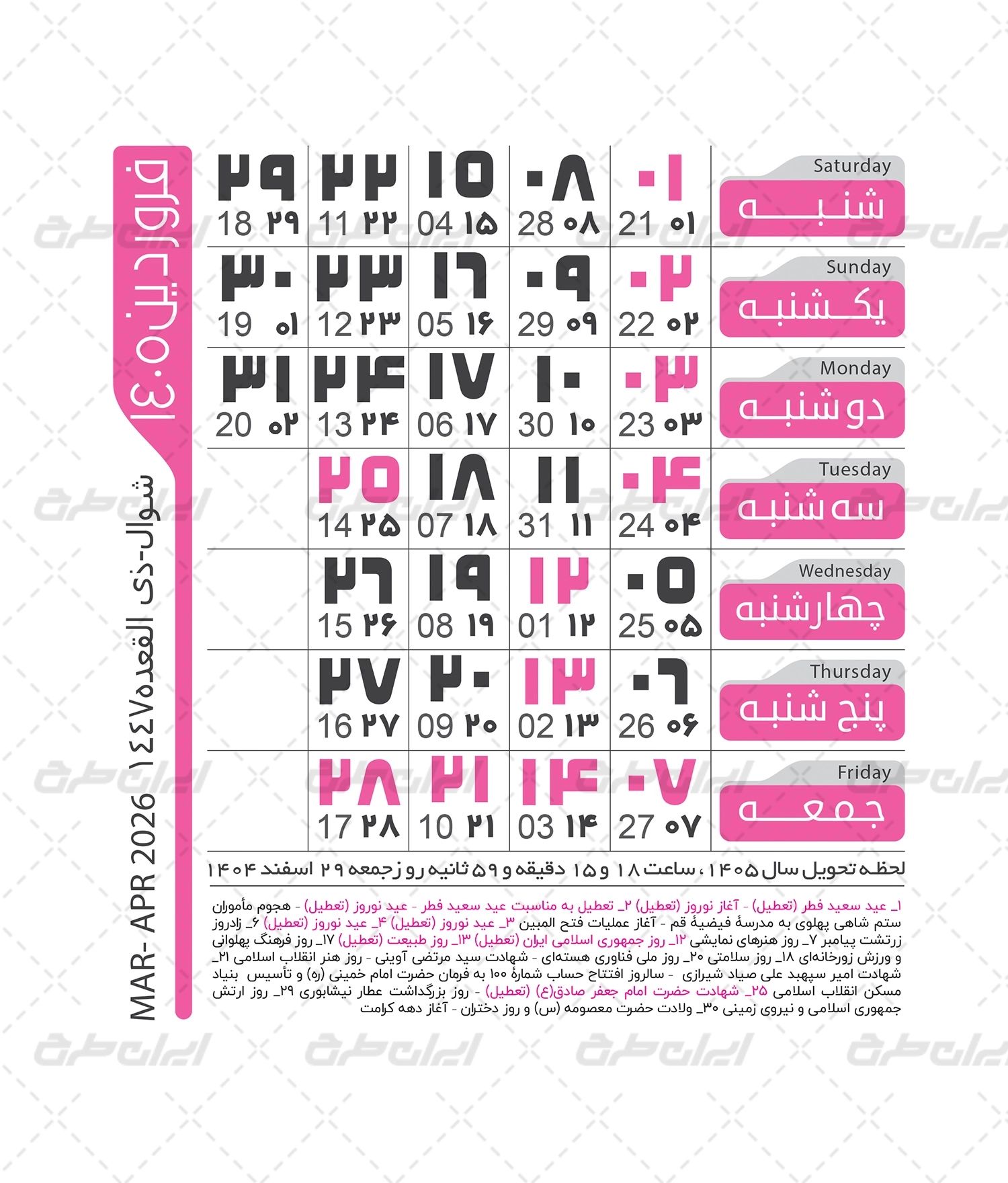 طرح لایه باز تقویم سال 1405 ،توسط تیم طراحان ایران طرح طراحی و در دسترس کاربران سایت قرار گرفته است.
