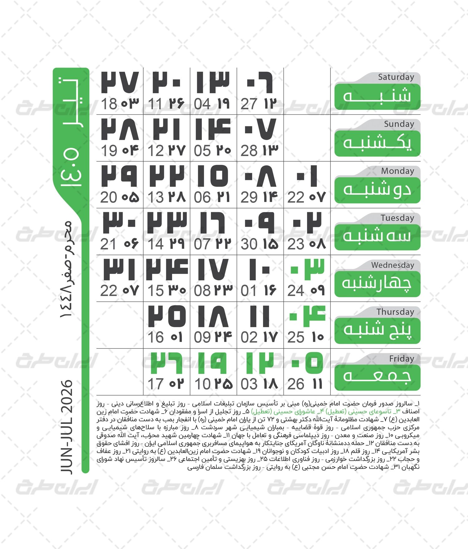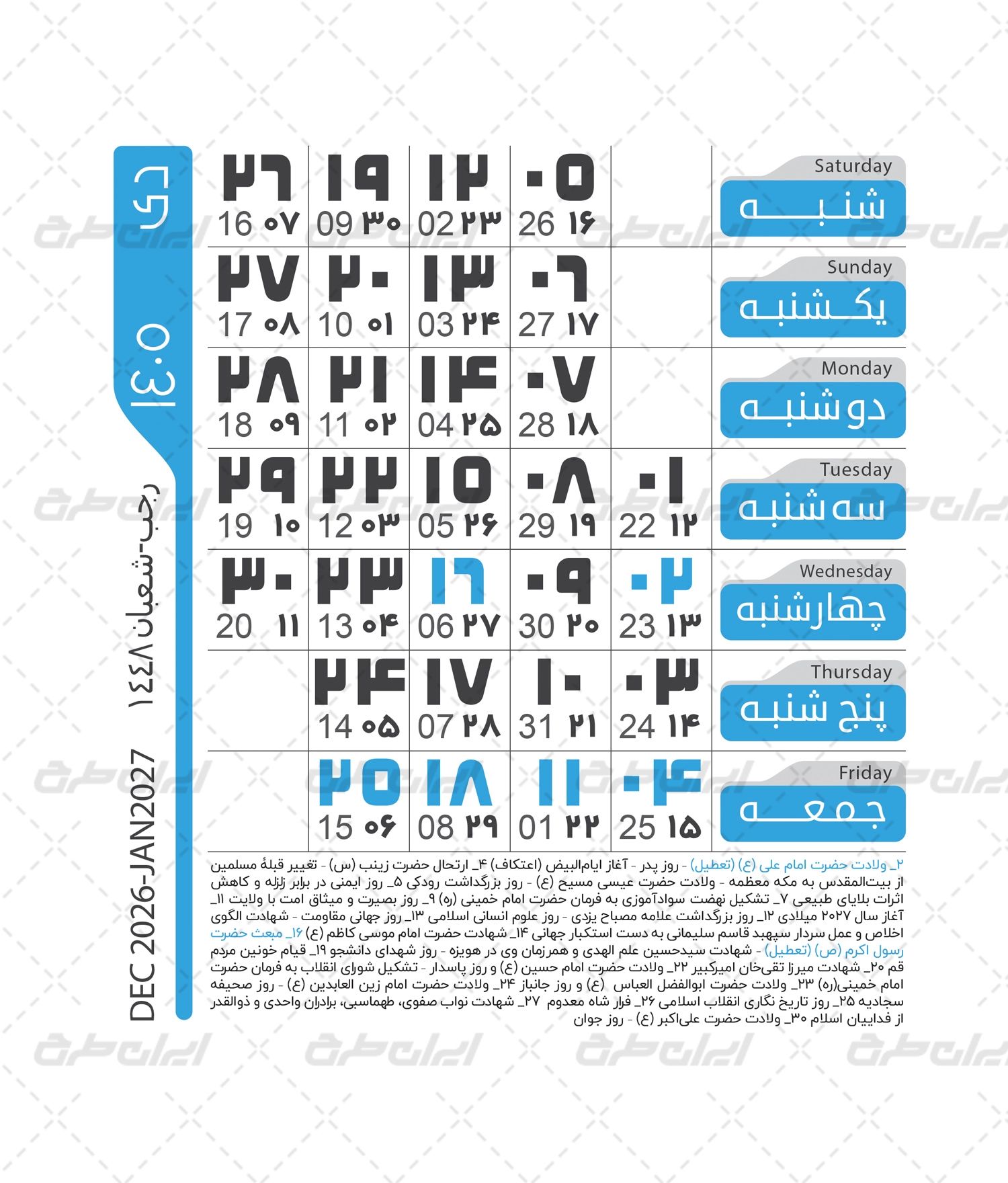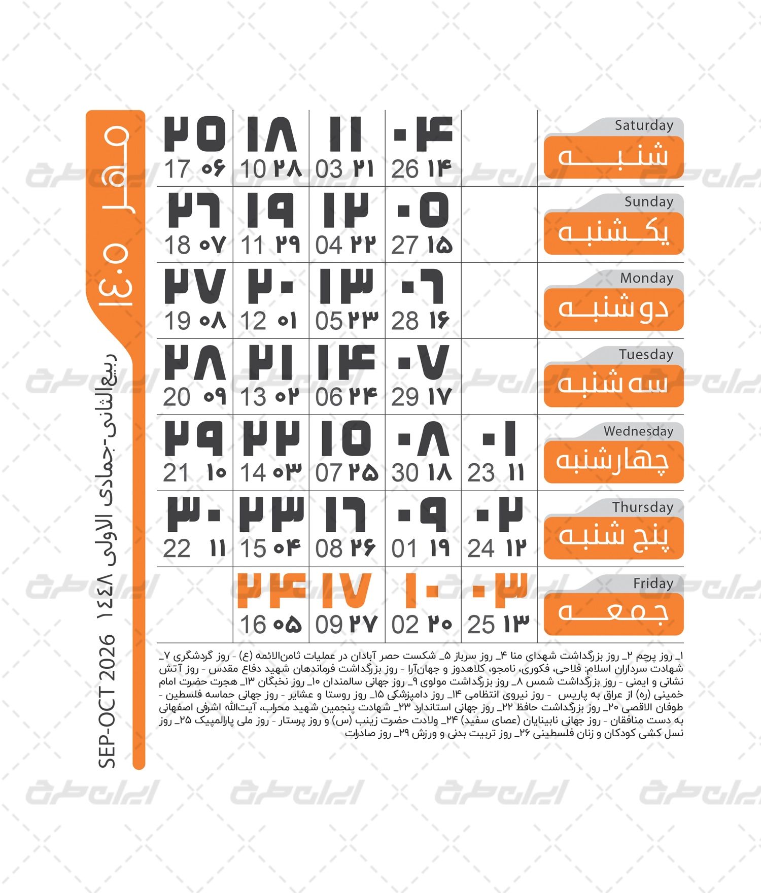 جدول بندی ماه های سال، ایام هفته، شمارش روز ها، مناسبت های شمسی و قمری، مناسبت های ملی و جهانی، لیبل ها و شیپ های کاربردی می باشد که به صورت لایه باز در نرم افزار فتوشاپ طراحی شده است.
