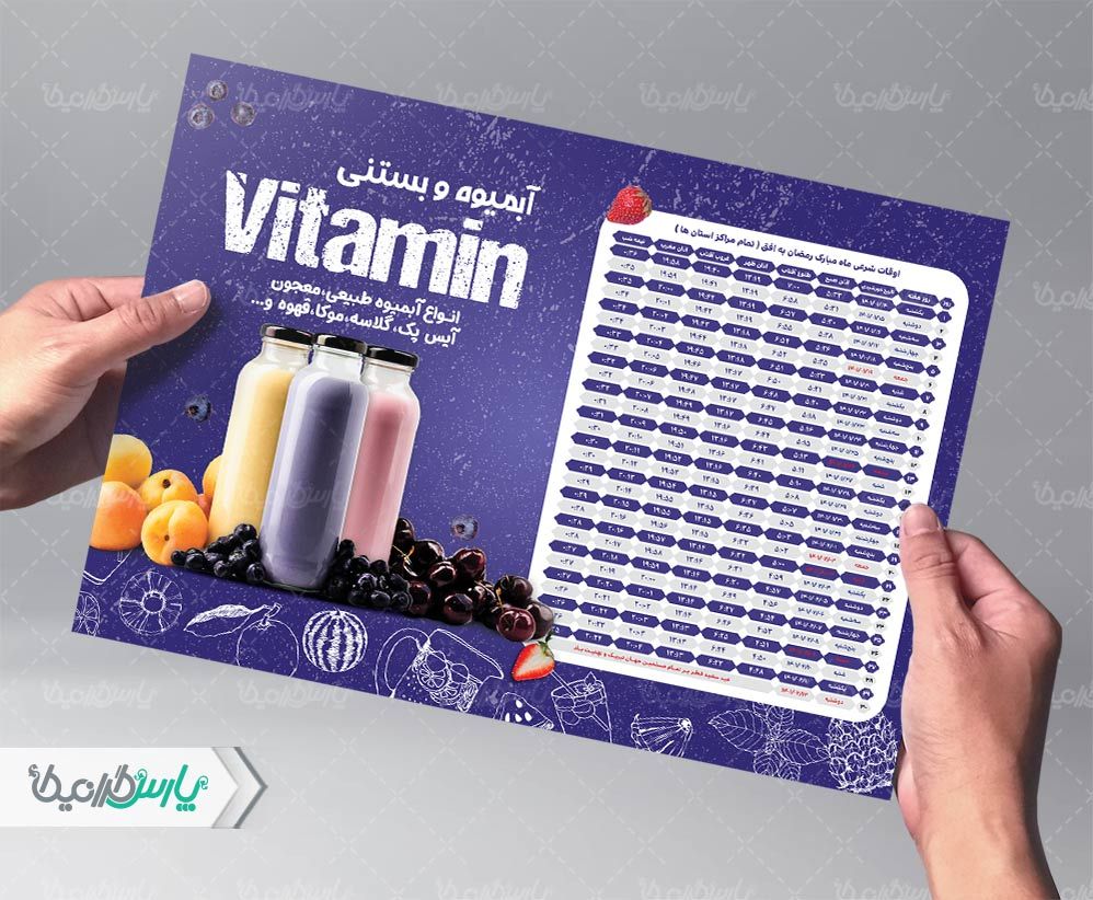 طرح اوقات شرعی ماه رمضان شامل: جدول اوقات شرعی ، جدول ماه رمضان ، تصویر لیوان آبمیوه می باشد که توسط تیم پارس گرافیک طراحی شده است. به دلیل استفاده از عناصر و المان های با کیفیت در طرح اوقات شرعی ماه رمضان، می توانید علاوه بر چاپ (به صورت عمودی)، در استوری اینستاگرام و یا دیگر پلت فرم های فضای مجازی استفاده نمایید. ضمنا به دلیل لایه باز بود طرح اوقات شرعی ماه رمضان می توانید با استفاده از نرم افزار فتوشاپ تغییرات دلخواه خود را اعمال کنید.