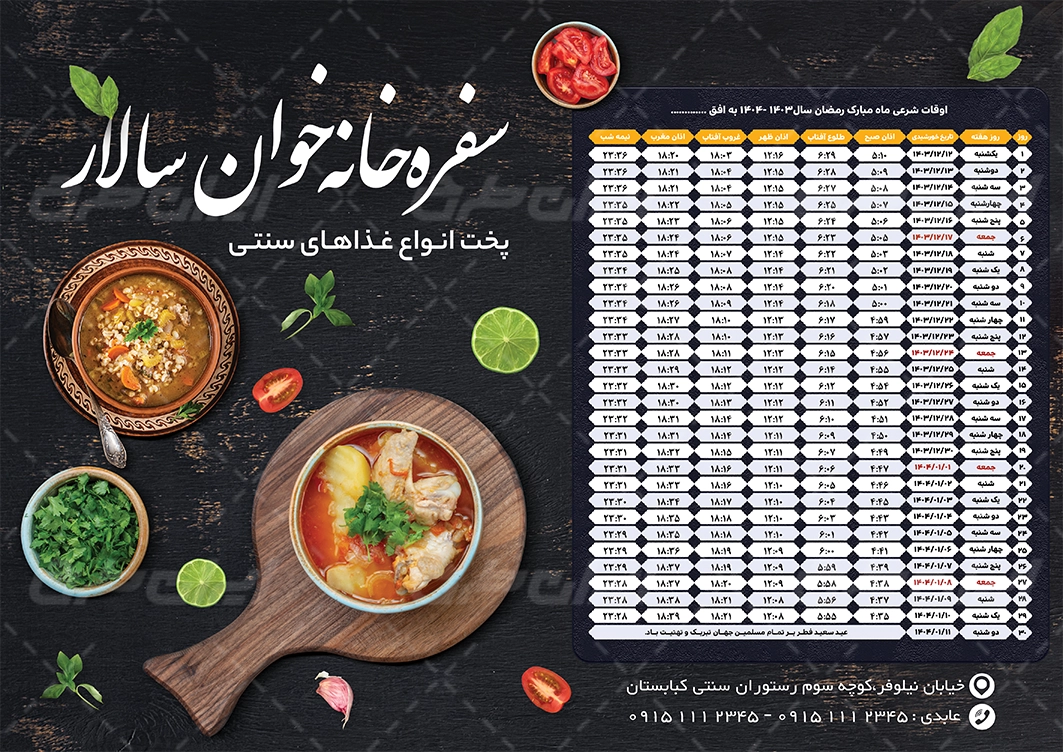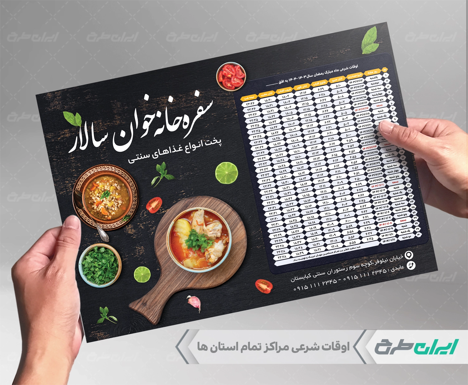 طرح اوقات شرعی ماه رمضان شامل: جدول اوقات شرعی ، جدول ماه رمضان ، تصویر غذای ایرانی می باشد که توسط تیم پارس گرافیک طراحی شده است. به دلیل استفاده از عناصر و المان های با کیفیت در طرح اوقات شرعی ماه رمضان، می توانید علاوه بر چاپ (به صورت عمودی)، در استوری اینستاگرام و یا دیگر پلت فرم های فضای مجازی استفاده نمایید. ضمنا به دلیل لایه باز بود طرح اوقات شرعی ماه رمضان می توانید با استفاده از نرم افزار فتوشاپ تغییرات دلخواه خود را اعمال کنید.