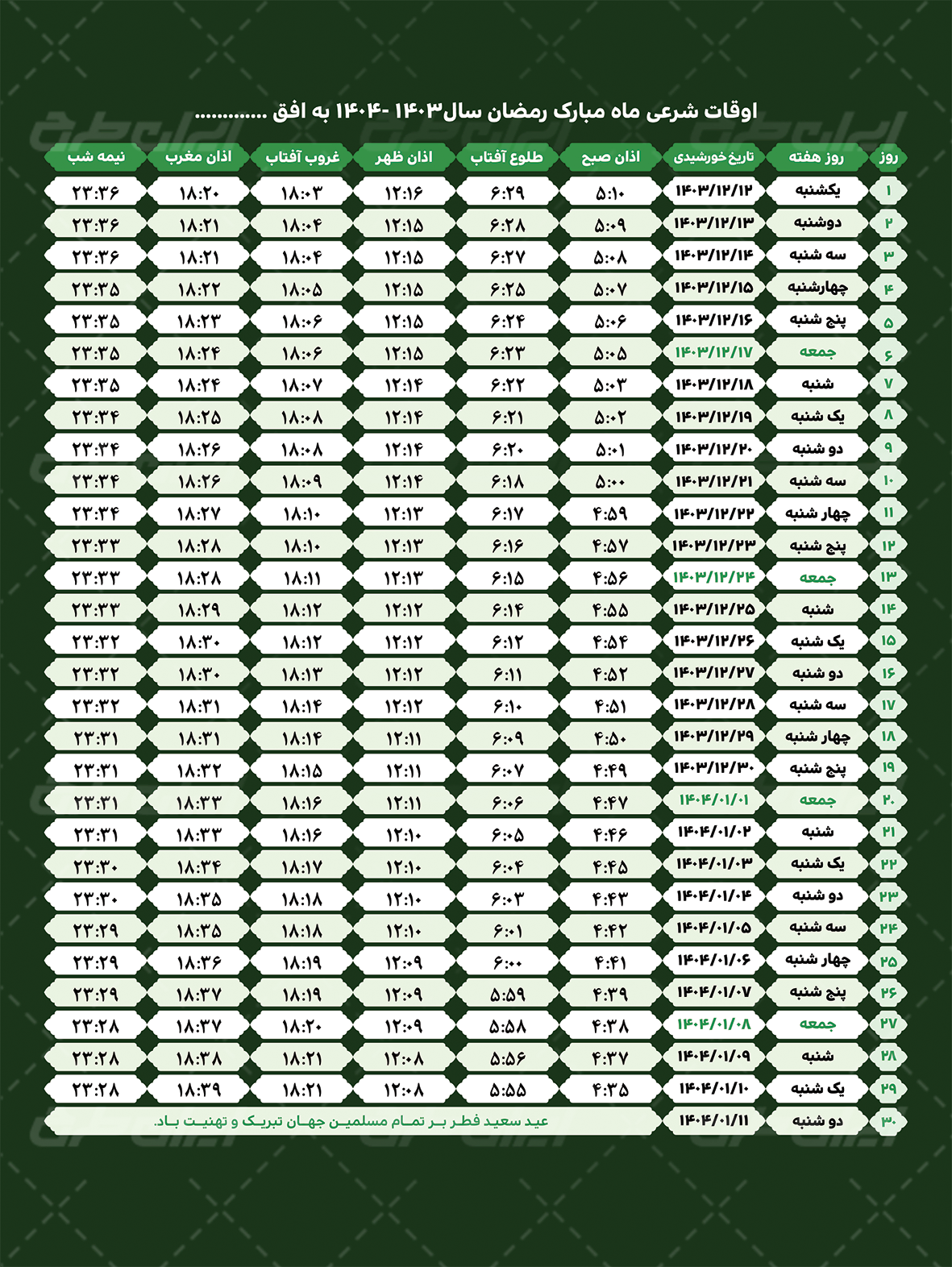 جدول اوقات شرعی ماه رمضان 1403