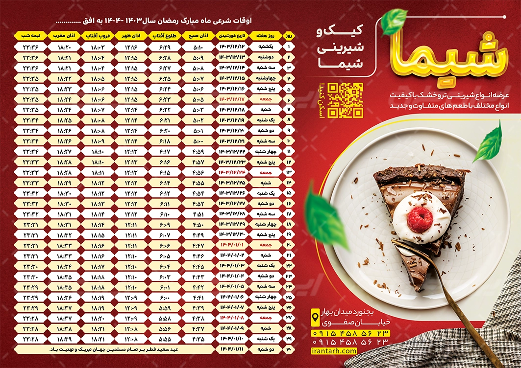 جدول اوقات شرعی ماه رمضان 1403 شیرینی فروشی