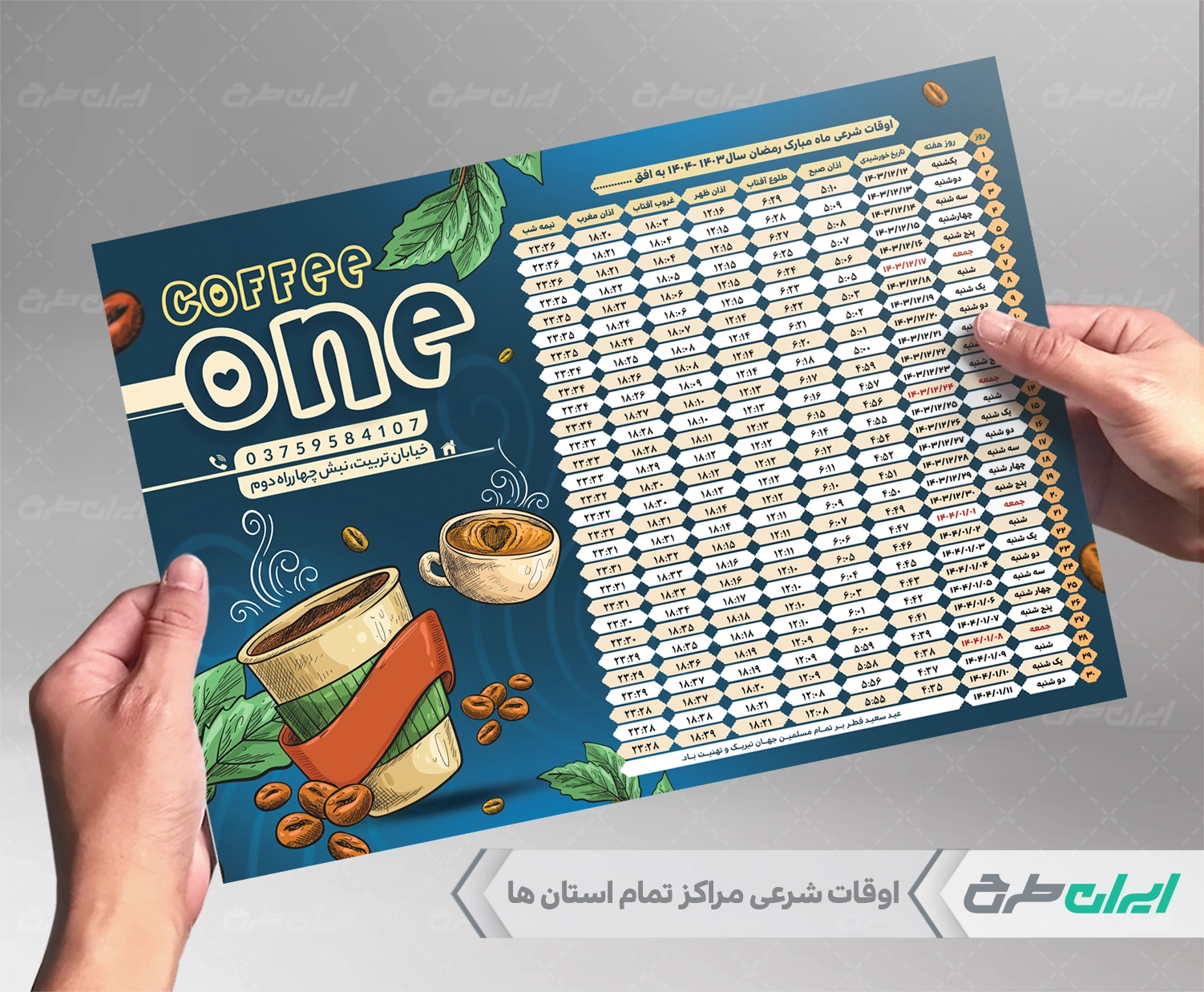 طرح اوقات شرعی سال 1403 شامل: جدول اوقات شرعی ، جدول ماه رمضان ، تصویر قهوه می باشد که توسط تیم ایران طرح طراحی شده است. به دلیل استفاده از عناصر و المان های با کیفیت در طرح اوقات شرعی ماه رمضان، می توانید علاوه بر چاپ (به صورت عمودی)، در استوری اینستاگرام و یا دیگر پلت فرم های فضای مجازی استفاده نمایید. ضمنا به دلیل لایه باز بود طرح اوقات شرعی ماه رمضان می توانید با استفاده از نرم افزار فتوشاپ تغییرات دلخواه خود را اعمال کنید.