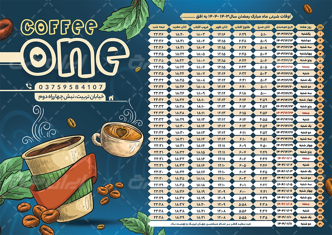 - استفاده از عکس با کیفیت قهوه مناسب با طرح جدول اوقات شرعی کافه قهوه