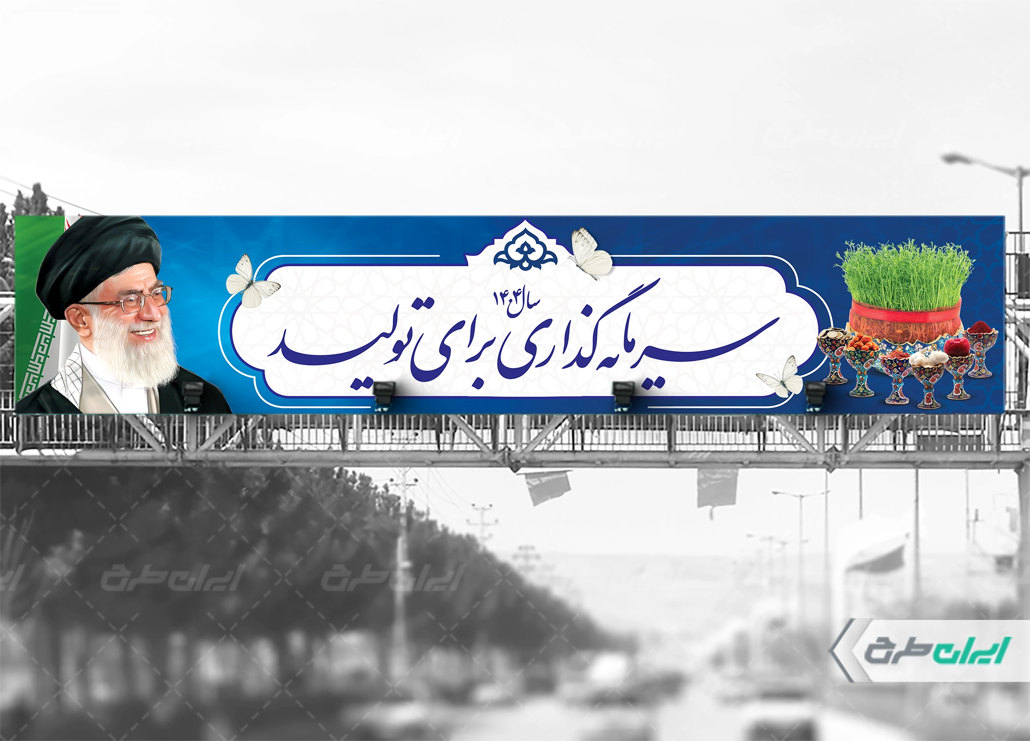 تصویر رهبری و متن شعار سال سرمایه گذاری برای تولید، که توسط تیم ایران طرح طراحی شده است.