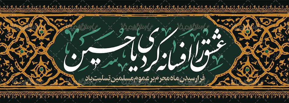 بنر لایه باز ایام محرم، بنر محرم، طرح بنر محرم، متن عشق را افسانه کردی یا حسین، کادر مذهبی، کادر تذهیب، نقوش مذهبی، کادر اسلیمی، کادر اسلامی، متن تسلیت ایام محرم