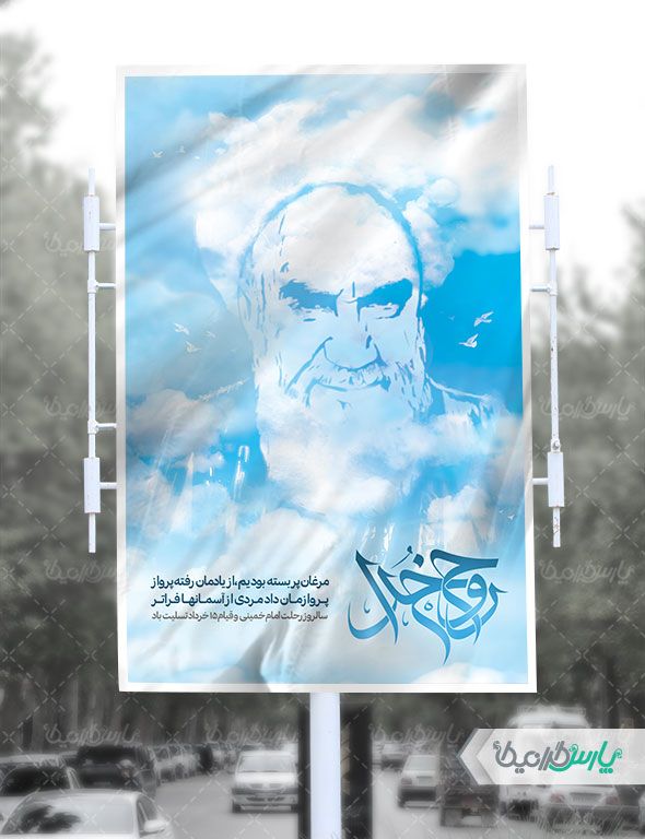 طرح لایه باز بنر رحلت امام خمینی ره بصورت عمودی با پس زمینه آسمان طراحی شده است .