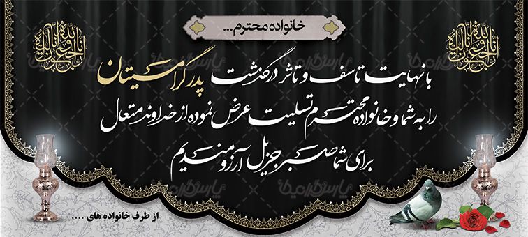 طرح بنر آگهی ترحیم، آگهی ترحیم، اعلامیه ترحیم مادر، اطلاعیه ترحیم، تایپوگرافی پدر، متن ثلث انالله و انا الیه راجعون، گل، کبوتر، کادر تذهیب، نقوش مذهبی زمینه بنر، تذهیب، کادر مذهبی، متن ابراز همدردی، پر، حاشیه تذهیب ، عرض تسلیت به خانواده متوفی ، بنر تسلیت، بنر اعلامیه ترحیم، طرح بنر آگهی ترحیم، تایپوگرافی