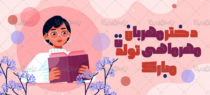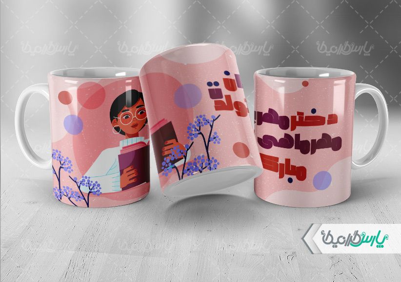 طرح ماگ متولیدن مهر، طرح ماگ، ماگ، طرح گرافیکی و فانتزی ماگ، وکتور دختر، وکتور کتاب، متن تبریک تولد