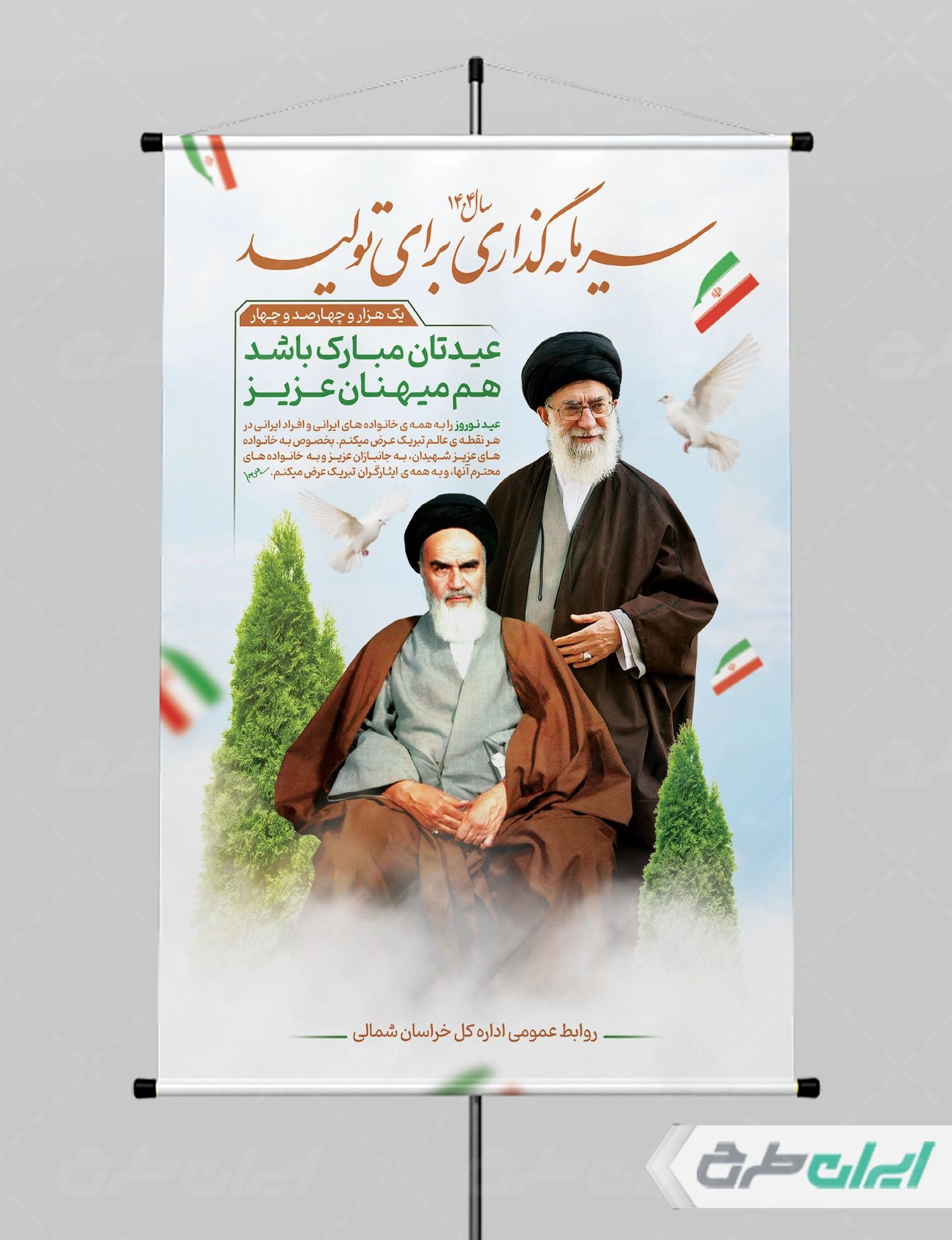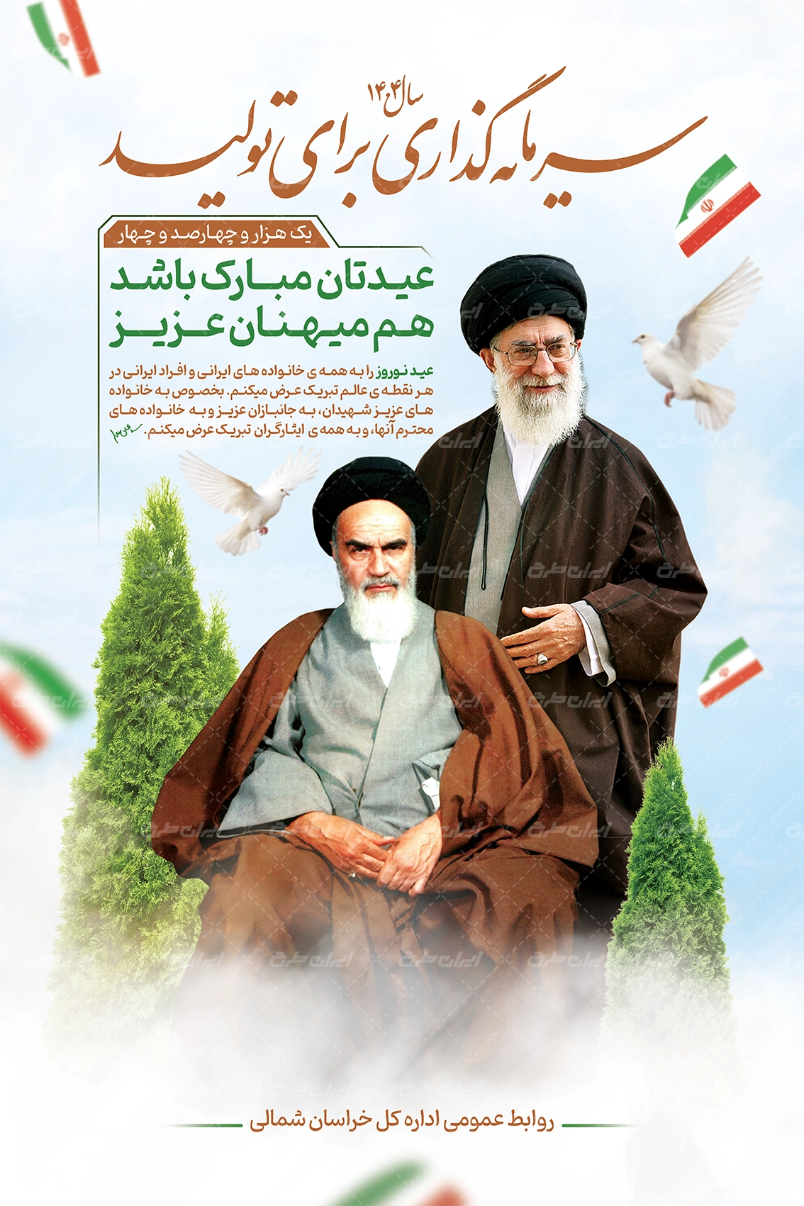 تصویر رهبری و متن شعار سال سرمایه گذاری برای تولید، که توسط تیم ایران طرح طراحی شده است.