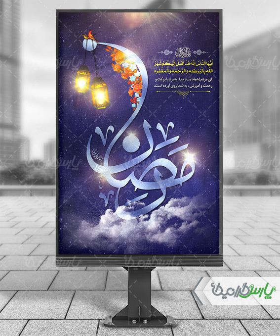 طرح بنر ماه رمضان بصورت عمودی با پس زمینه آسمان شب طراحی شده است .