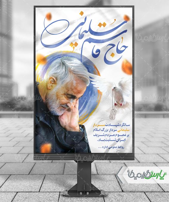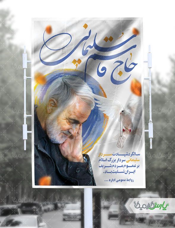 در طرح بنر لایه باز ترحیم از تصویر کبوتر و تصویر سردار شهید سلیمانی استفاده شده است .