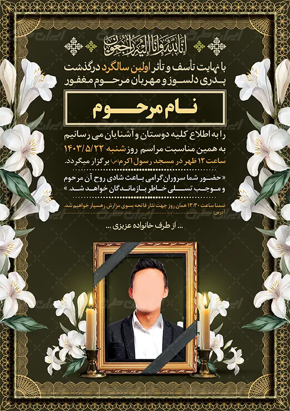 طرح لایه باز آگهی ترحیم ابزاری مؤثر برای اطلاعرسانی در مراسمهای یادبود و گرامیداشت درگذشتگان است. استفاده از این طرحها به خانوادهها و مؤسسات مرتبط امکان میدهد تا آگهی را بهصورت سریع، زیبا و با رعایت اصول مذهبی و فرهنگی طراحی کنند. تصاویر مرتبط، متن تسلیت و اطلاعات مراسم مانند تاریخ، ساعت و محل برگزاری بهسادگی در این قالبها جایگذاری میشوند و جلوهای رسمی و احترامآمیز به آگهی میبخشند.