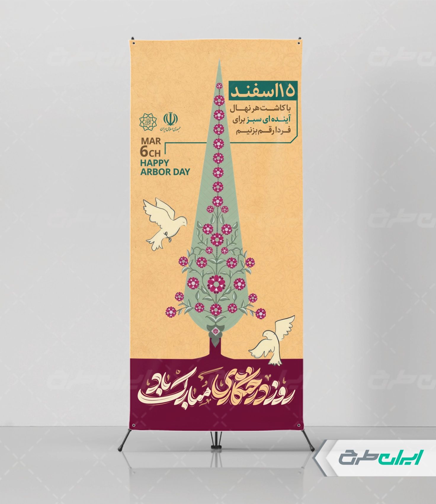 تصویر درخت و متن گرامیداشت 15 اسفند روز درختکاری می باشد که توسط تیم ایران طرح طراحی شده است.
