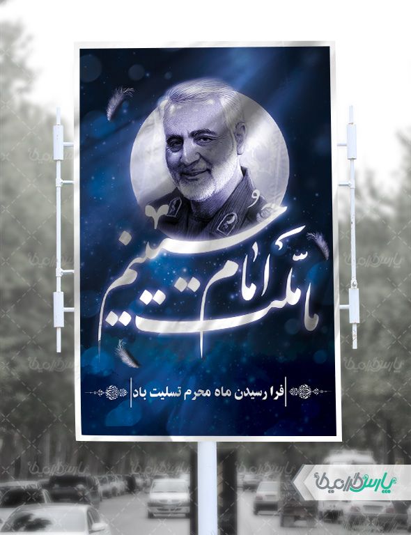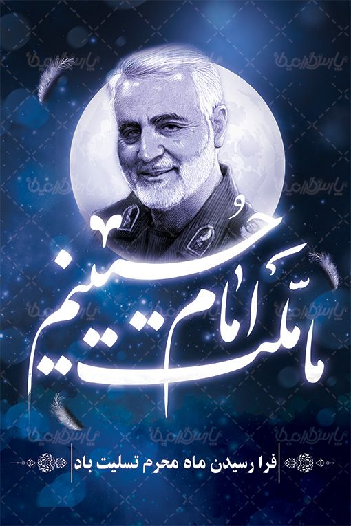 طرح بنر لایه باز ایام سوگواری محرم شامل: متن نستعلیق ما ملت امام حسینیم، متن نستعلیق السلام علی الحسین و علی علی بن الحسین، تصویر با کیفیت شهید سردار قاسم سلیمانی، کتیبه، حاشیه تذهیب، تذهیب و متن تسلیت ایام محرم می باشد که توسط طراحان پارس گرافیک در نرم افزار فتوشاپ طراحی شده است. به دلیل لایه باز (قابل ویرایش توسط کاربران در نرم افزار فتوشاپ Adobe Photoshop) بودن و کیفیت بالای عناصر و المان های استفاده شده در طرح، می توانید علاوه بر چاپ بنر(به صورت عمودی)، در استوری اینستاگرام و سایر پلت فرم های فضای مجازی جهت عرض تسلیت و ابراز همدردی با امت بزرگ اسلامی استفاده نمایید.