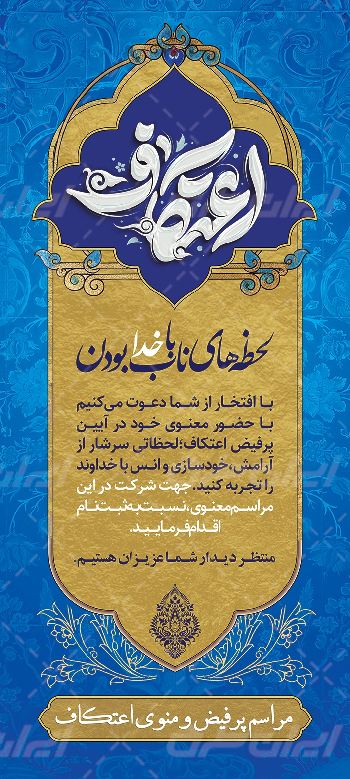 تذهیب و متن مرتبط با بنر اطلاع رسانی مراسم اعتکاف می باشد که توسط تیم ایران طرح طراحی شده است.