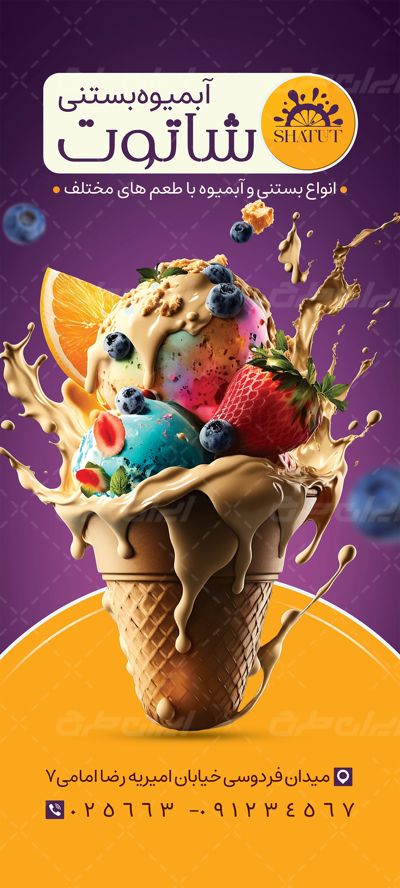 تیم ایران طرح طرح بنر لایه باز بستنی و آبمیوه جهت تبلیغات و بازاریابی این مکان را برای کاربران طراحی نموده است.