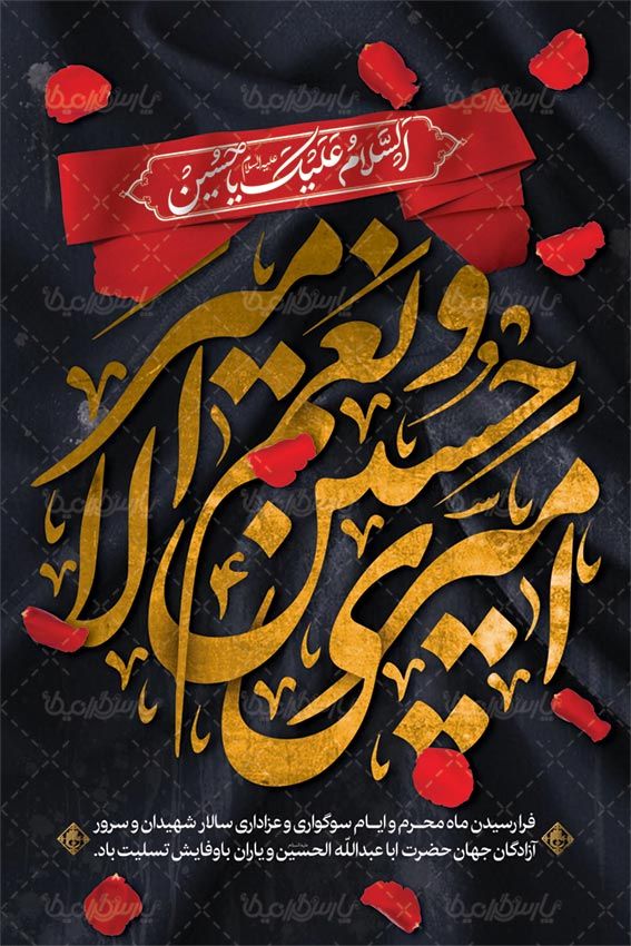 طرح بنر محرم، بنر لایه باز محرم، طرح لایه باز بنر ایام محرم، تایپوگرافی حسین، گل و گلبرگ، تصویر با کیفیت جاشمعی، شمع، تذهیب، حاشیه تذهیب، نقوش مذهبی، متن تسلیت ایام محرم
