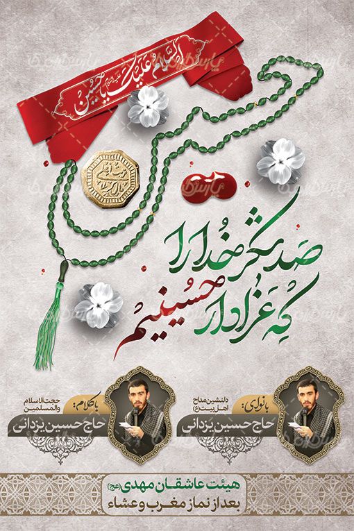 طرح بنر اطلاع رسانی محرم، بنر لایه باز محرم، طرح لایه باز بنر ایام محرم، تایپوگرافی حسین، تسبیح، مهر، لکه خون، سربند امام حسین، حاشیه تذهیب، تذهیب، متن صد هزار شکر که عزادار حسینم، کادر اسلیمی