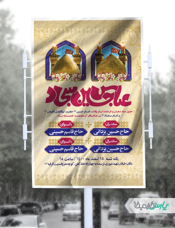 طرح بنر اعیاد شعبانیه شامل: حرم ، تایپوگرافی عباس حسین سجاد متن گرامیداشت ماه شعبان می باشد که توسط تیم پارس گرافیک طراحی شده است. به دلیل استفاده از عناصر و المان های با کیفیت در طرح بنر مناسبتی ، می توانید علاوه بر چاپ بنر (به صورت افقی)، در استوری اینستاگرام و یا دیگر پلت فرم های فضای مجازی استفاده نمایید. ضمنا به دلیل لایه باز بود طرح بنر اعیاد شعبانیه را می توانید با استفاده از نرم افزار فتوشاپ تغییرات دلخواه خود را اعمال کنید.