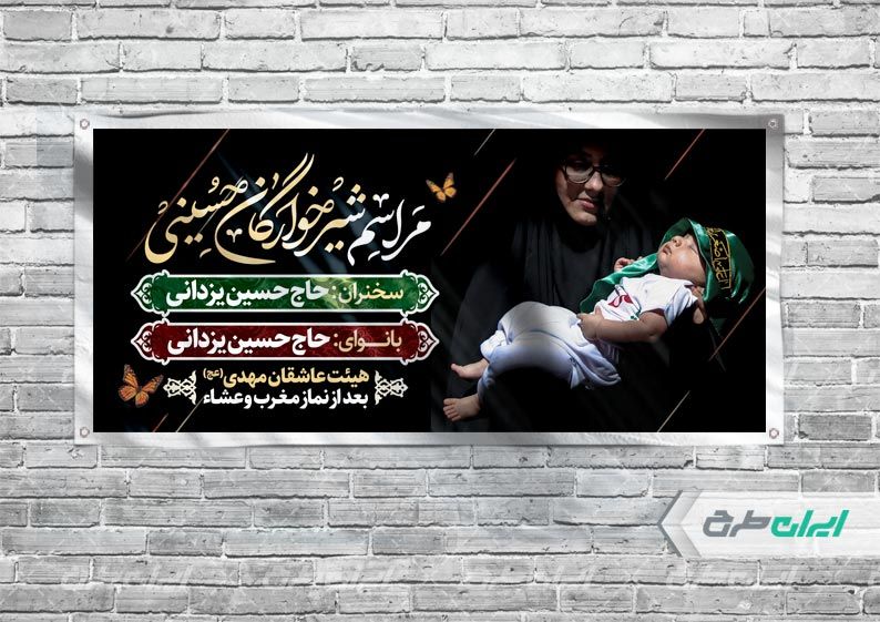 طرح بنر مراسم شیرخوارگان شامل: تصویر عزادار حسینی و نوزاد و متن مرتبط در طرح بنر می باشد که توسط طراحان ایران طرح در نرم افزار فتوشاپ طراحی شده است. به دلیل لایه باز (قابل ویرایش توسط کاربران در نرم افزار فتوشاپ Adobe Photoshop) بودن و کیفیت بالای عناصر و المان های استفاده شده در طرح، می توانید علاوه بر چاپ بنر(به صورت افقی)، در استوری اینستاگرام و سایر پلت فرم های فضای مجازی جهت عرض تسلیت و ابراز همدردی با امت بزرگ اسلامی استفاده نمایید.
