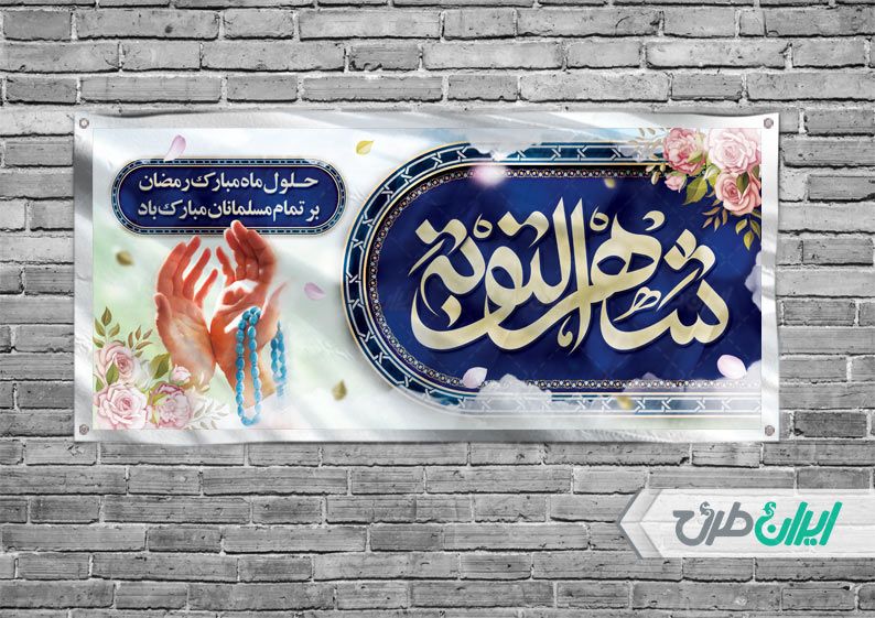 طرح بنر لایه باز ماه رمضان با زمینه سفید و آبی، تایپوگرافی شهر التوبه و تصویر گل و تصویر دعا کردن، با استفاده از تذهیب پنج الفبای کوفی، یک طرح زیبا و جذاب برای تبلیغات ماه مبارک رمضان است.