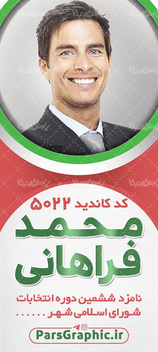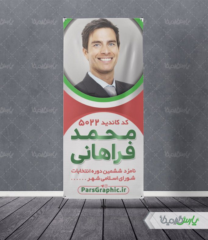 همانطور که در تصویر مشخص است از پرچم جمهوری اسلامی ایران در پس زمینه استفاده شده است و شما برای چاپ فقط کافی است تصویر نامزد انتخابات را جایگزین تصویر پیش فرض طرح کنید و نام نماینده را تغییر دهید.