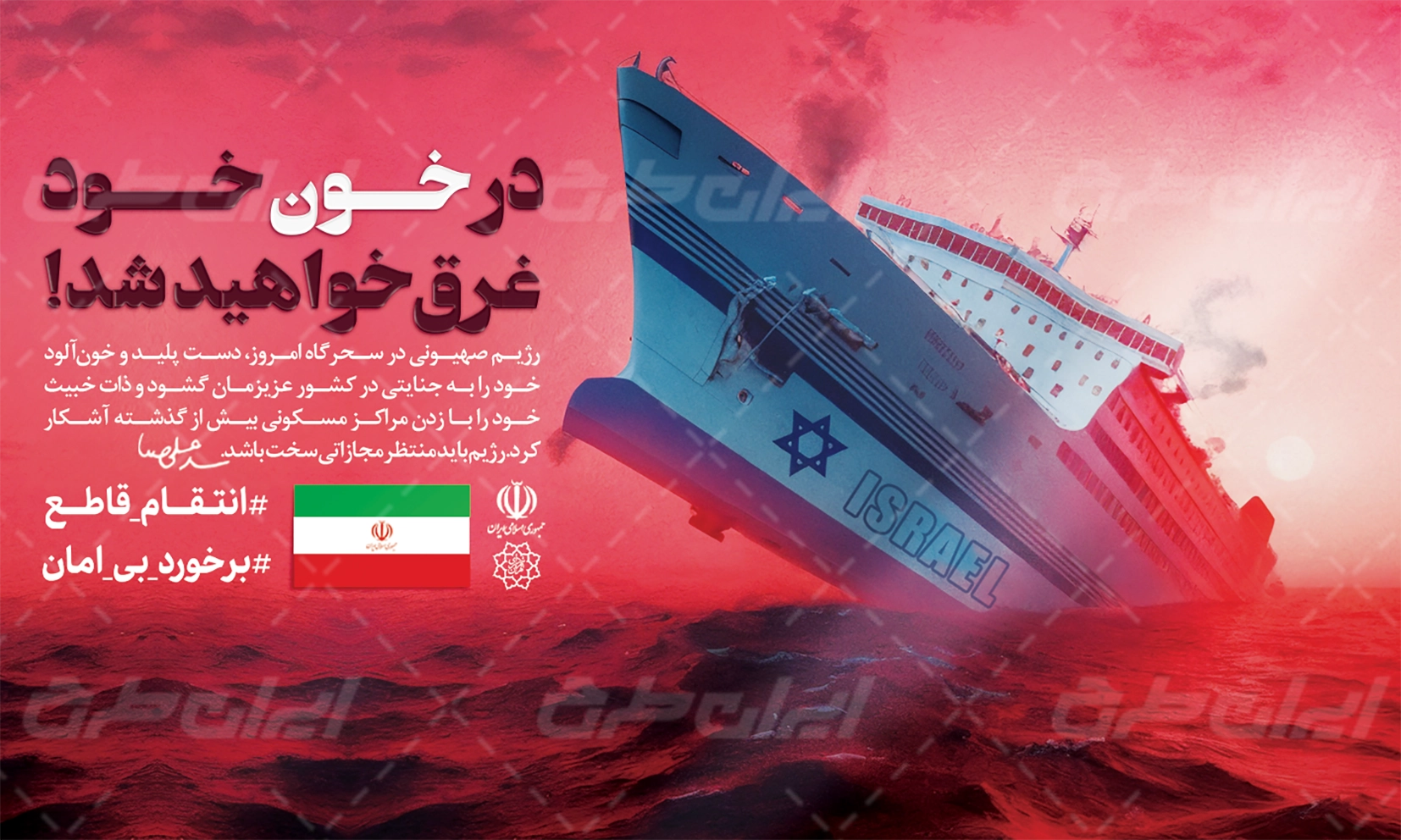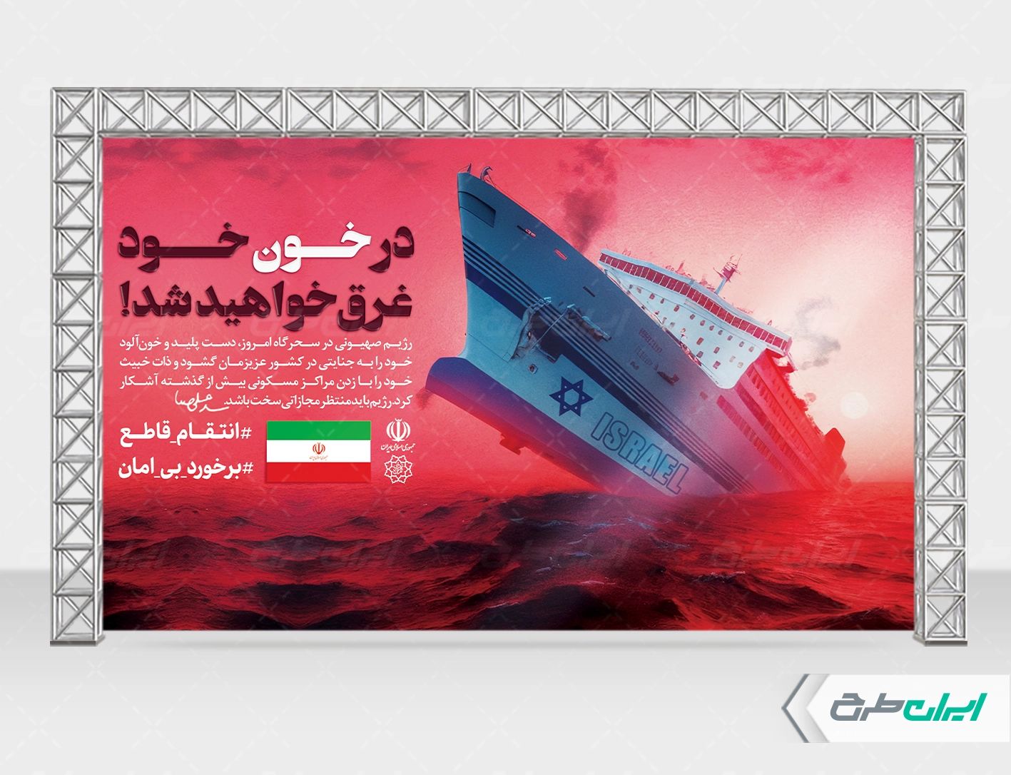 تصویر کشتی در حال غرق شدن و متن مرتبط با این حمله موشکی است که توسط تیم خلاق ایران طرح طراحی شده است.