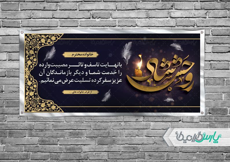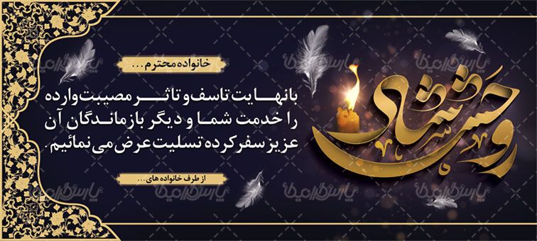 بنر ترحیم، بنر تسلیت، اطلاعیه ترحیم، تایپوگرافی روحش شاد، شمع، پر، کادر اسلیمی، کادر مذهبی، حاشیه تذهیب، متن تسلیت به صاحب عزا، اطلاعیه ترحیم، آگهی ترحیم، بنر تسلیت