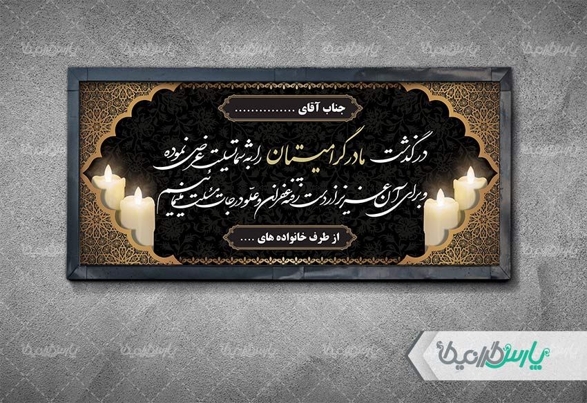طرح بنر تسلیت بصورت افقی و با زمینه قهوه ای با استفاده از شمع طراحی شده است .